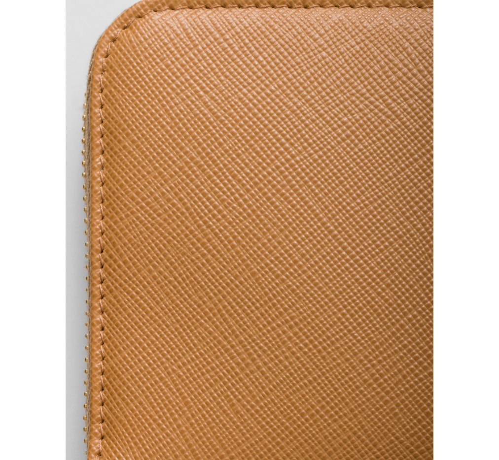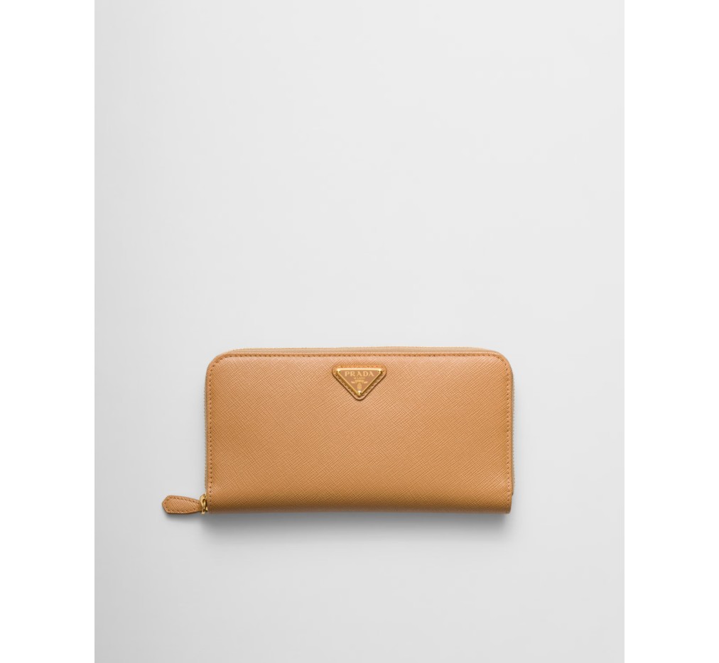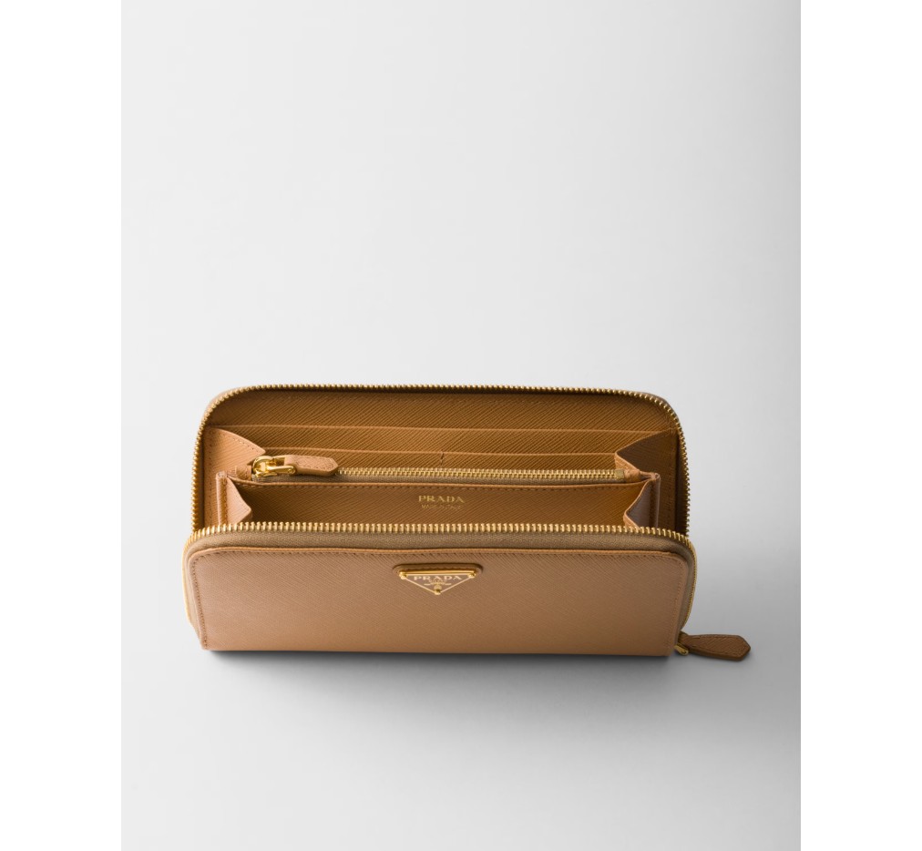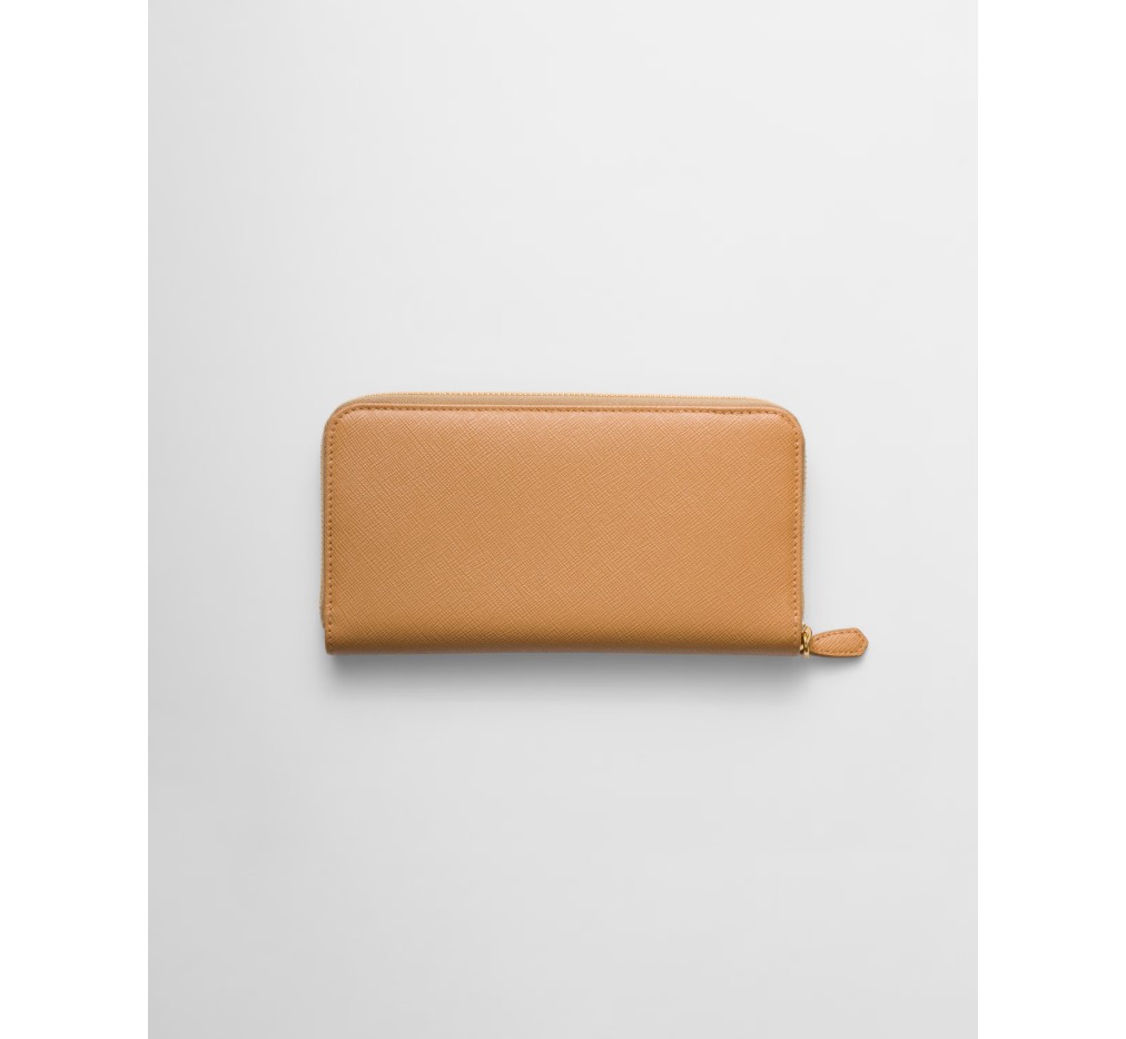 곡선형 모서리의 사피아노 가죽 지갑입니다. 지퍼가 달린 지폐 수납 공간 1개, 신용카드 슬롯 12개, 서류 포켓 6개, 지퍼가 달린 동전 수납 공간 1개로 구성되어 있습니다. 프라다 로고와 지퍼 잠금으로 마감되었습니다.