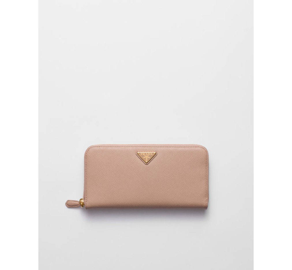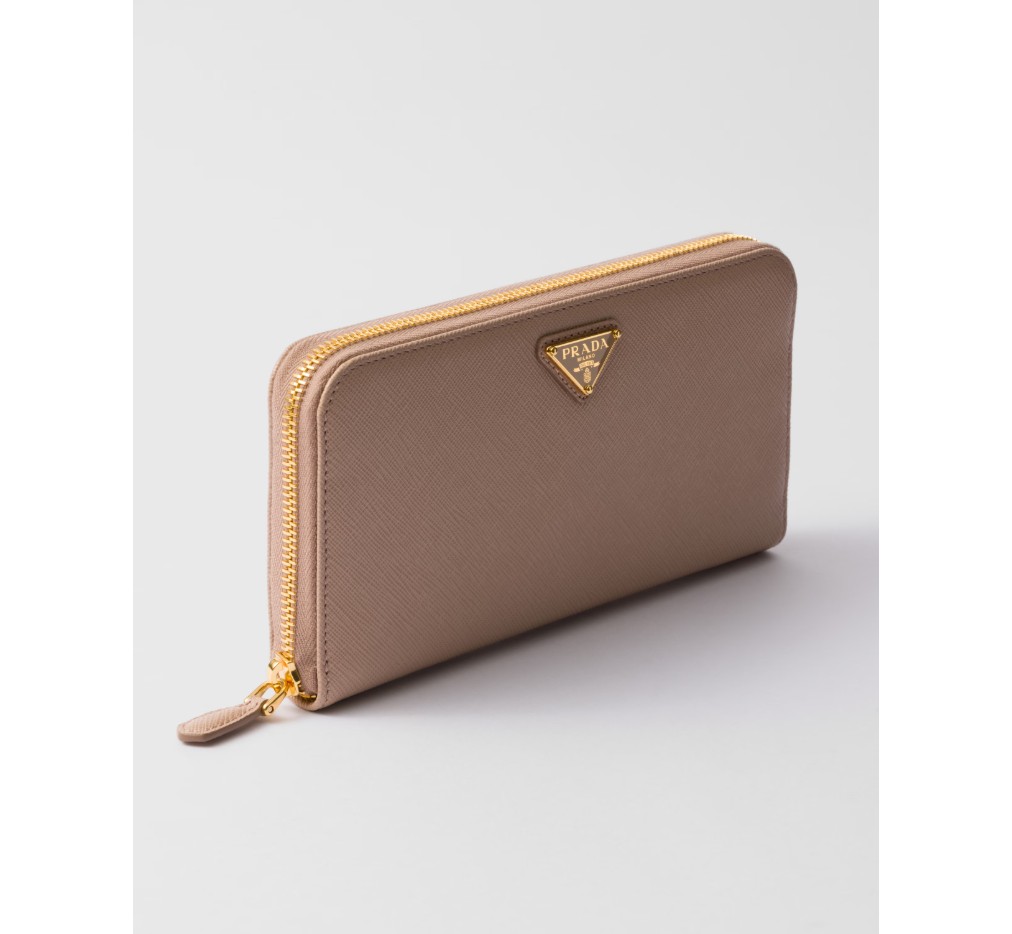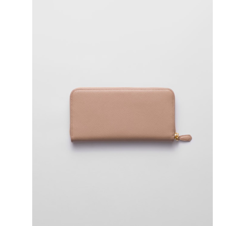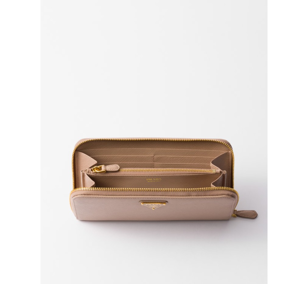 곡선형 모서리의 사피아노 가죽 지갑입니다. 지퍼가 달린 지폐 수납 공간 1개, 신용카드 슬롯 12개, 서류 포켓 6개, 지퍼가 달린 동전 수납 공간 1개로 구성되어 있습니다. 프라다 로고와 지퍼 잠금으로 마감되었습니다.