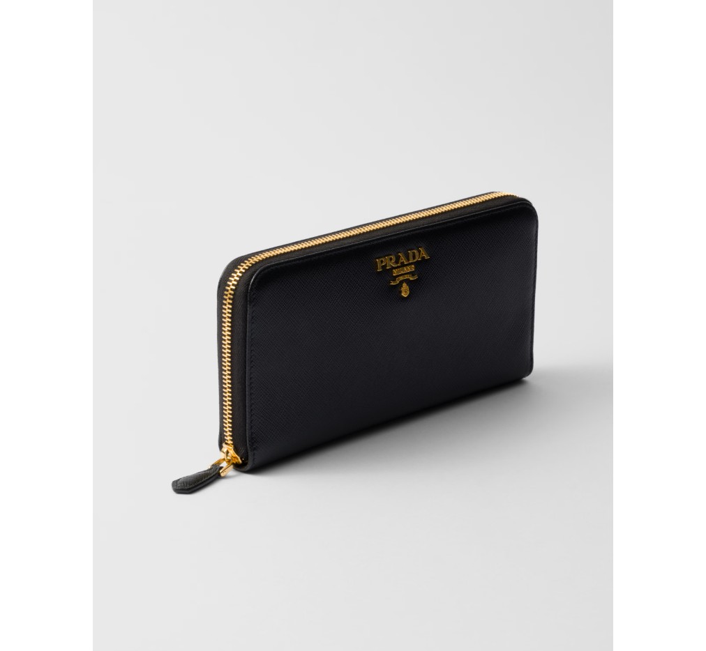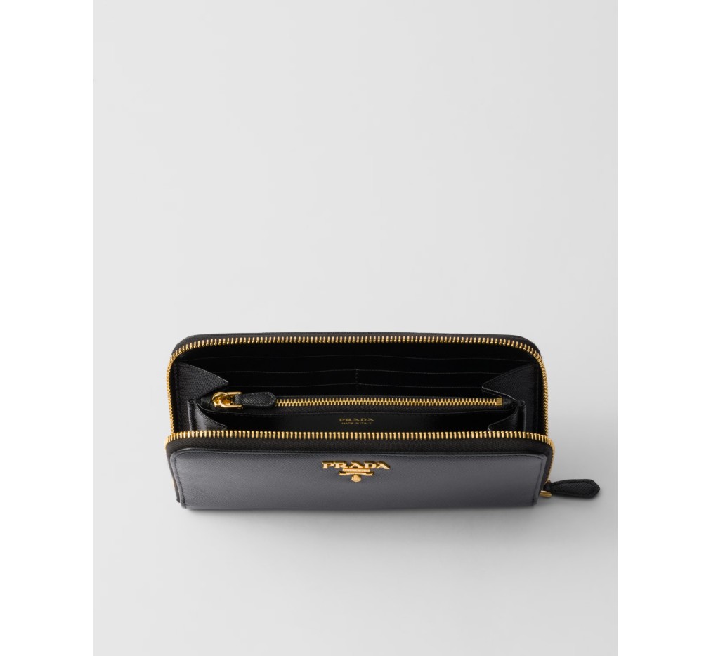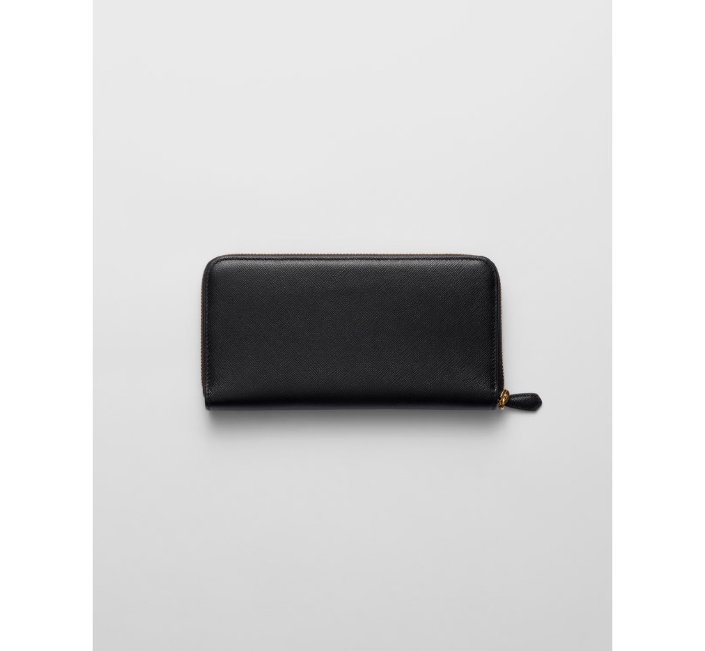 이 사피아노 가죽 지갑은 프라다 레터링으로 장식되어 있습니다. 라운드 지퍼를 열면 다양한 카드 슬롯, 포켓, 그리고 동전을 보관할 수 있는 지퍼 수납공간이 있습니다.