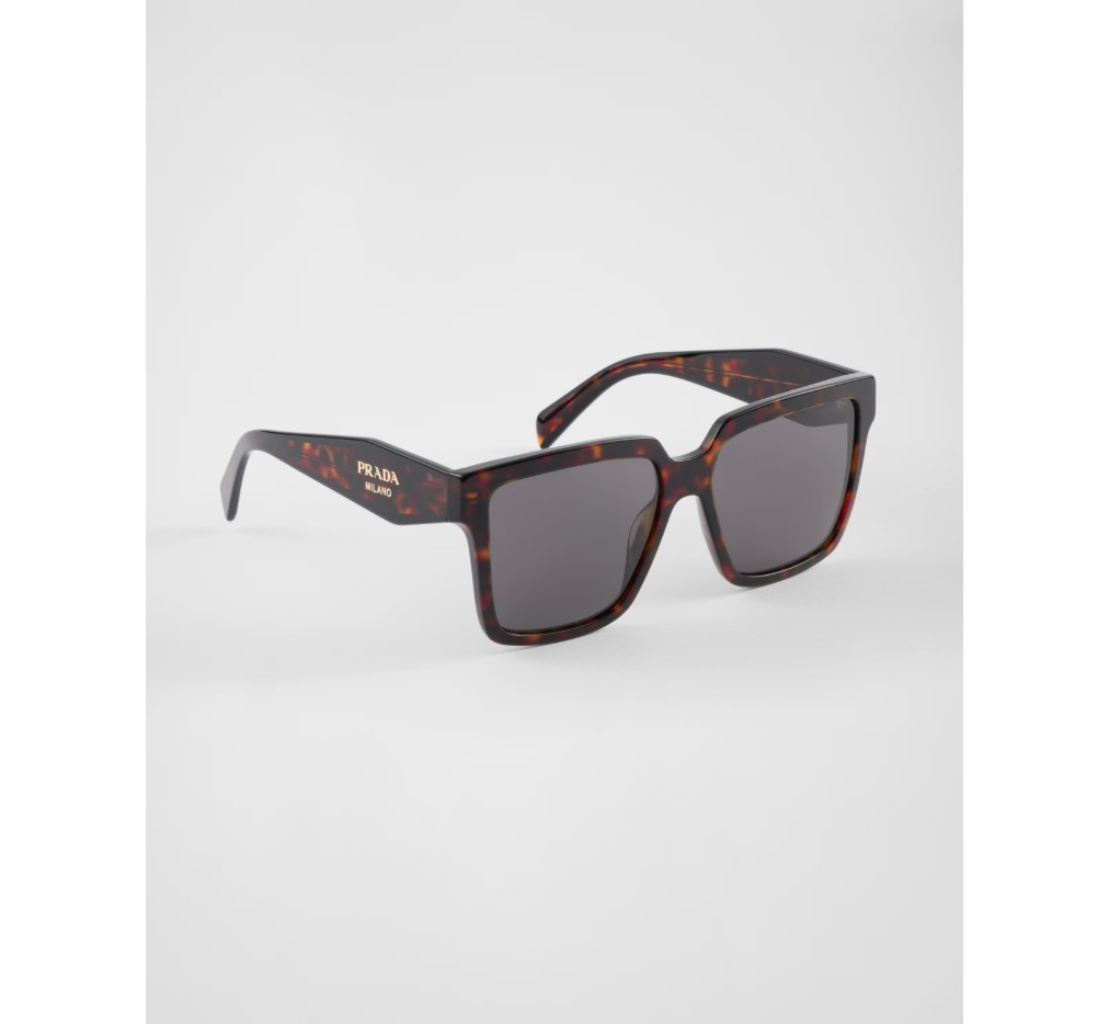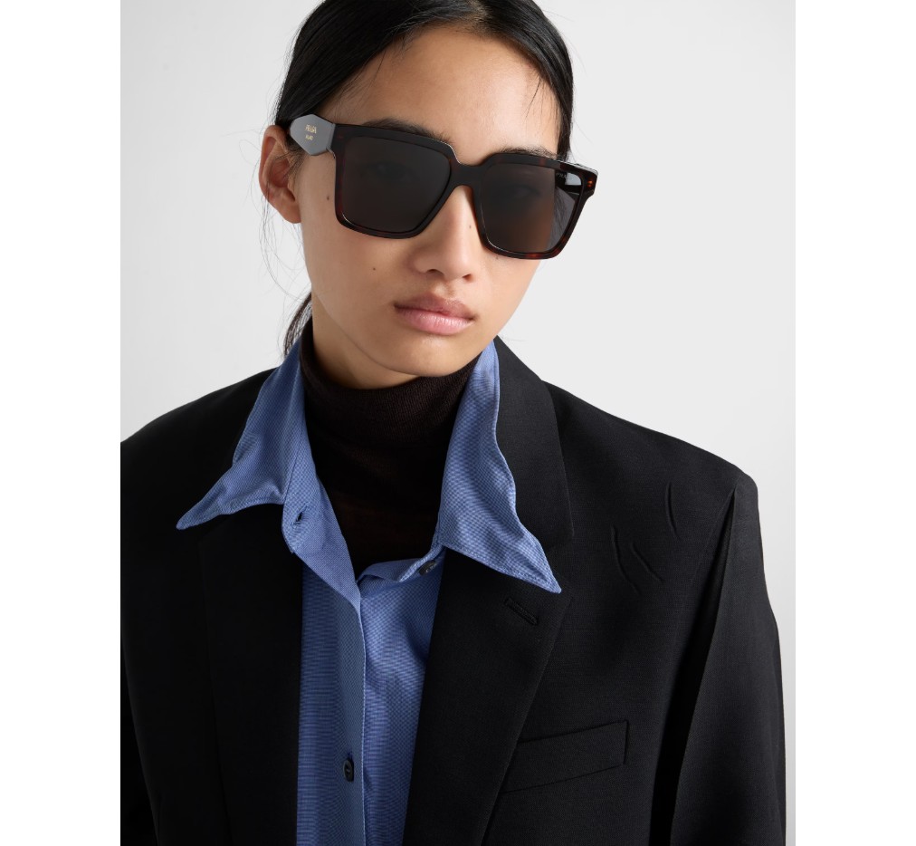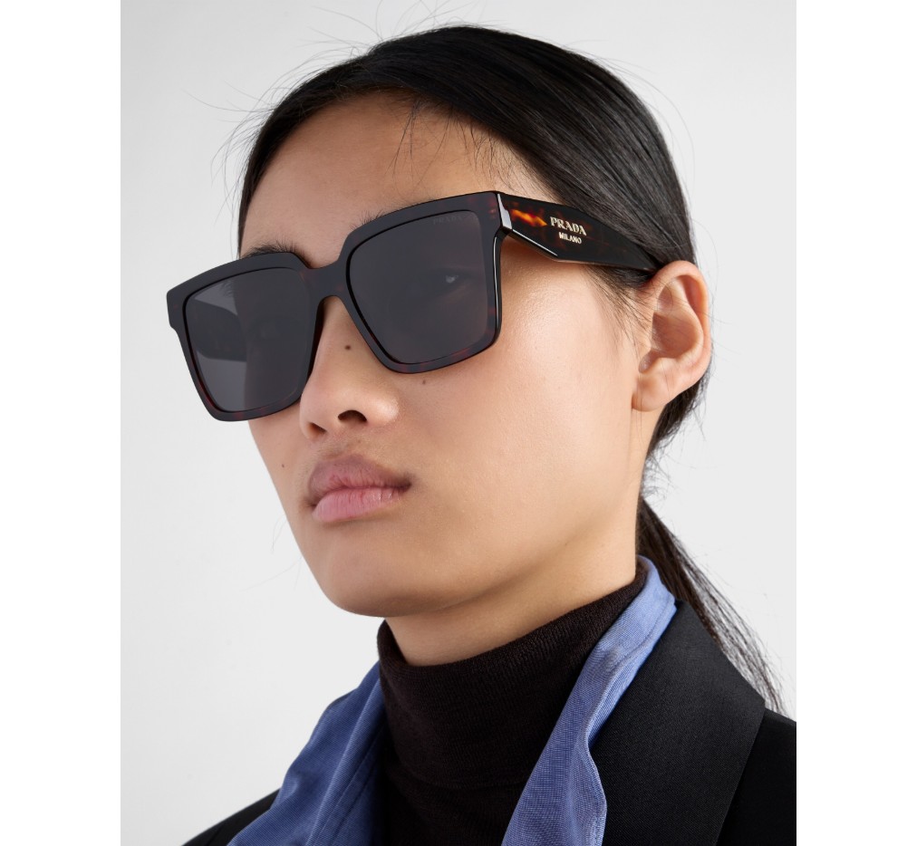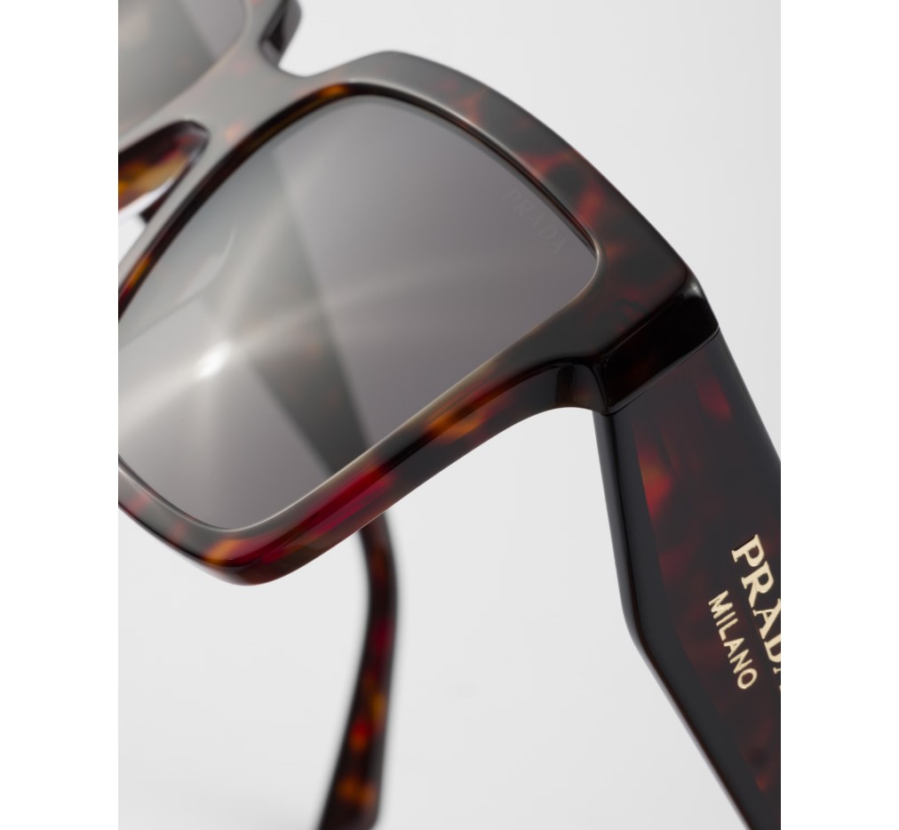 직사각형 프레임과 두툼한 볼륨감이 특징인 선글라스입니다. 기하학적인 템플에 대비되는 색상의 레이어드 디테일이 세련되고 현대적인 감각을 더합니다. 프라다 레터링 로고가 새겨져 있습니다.