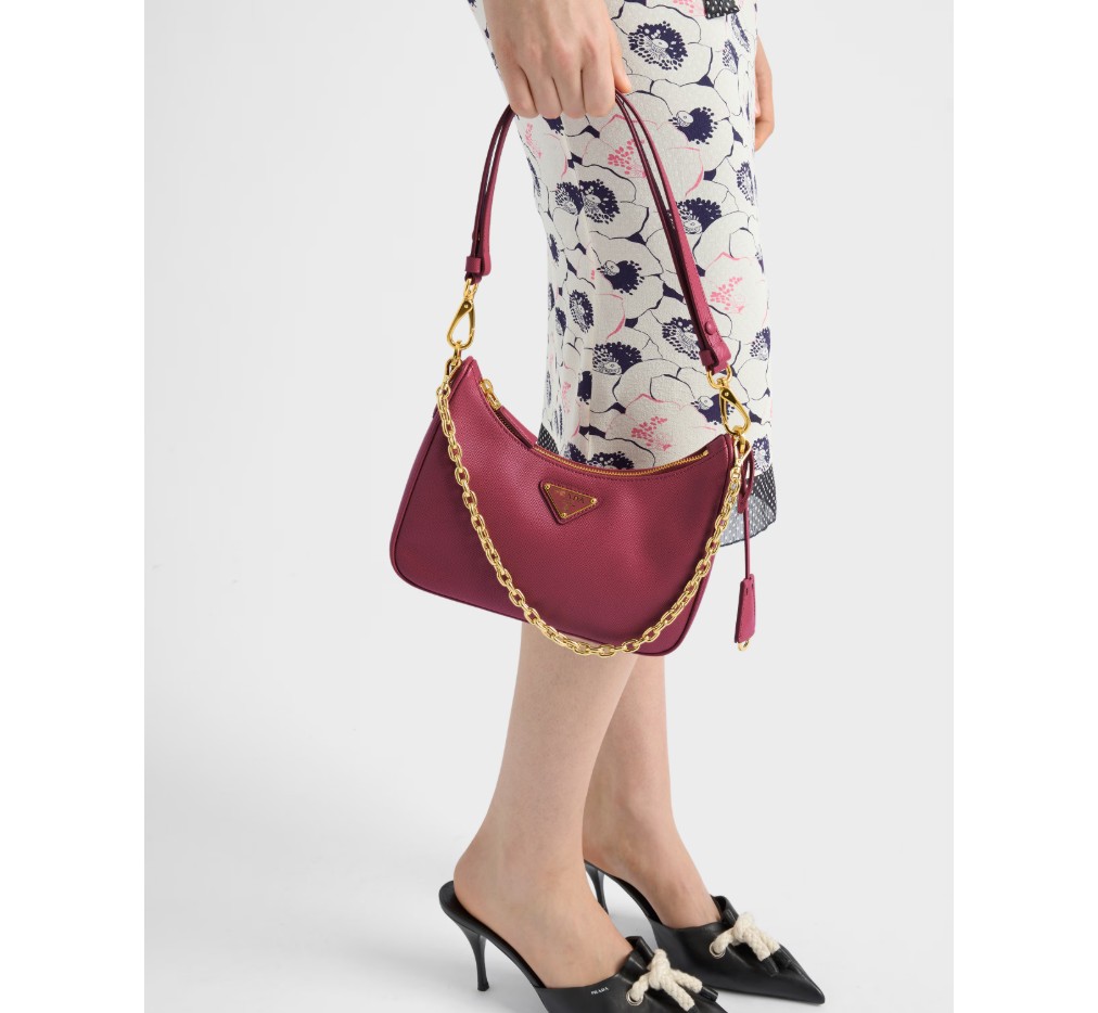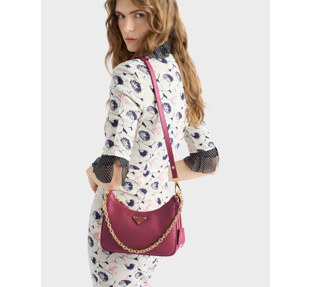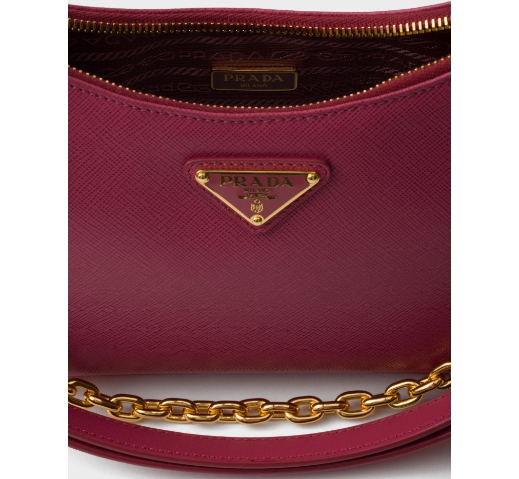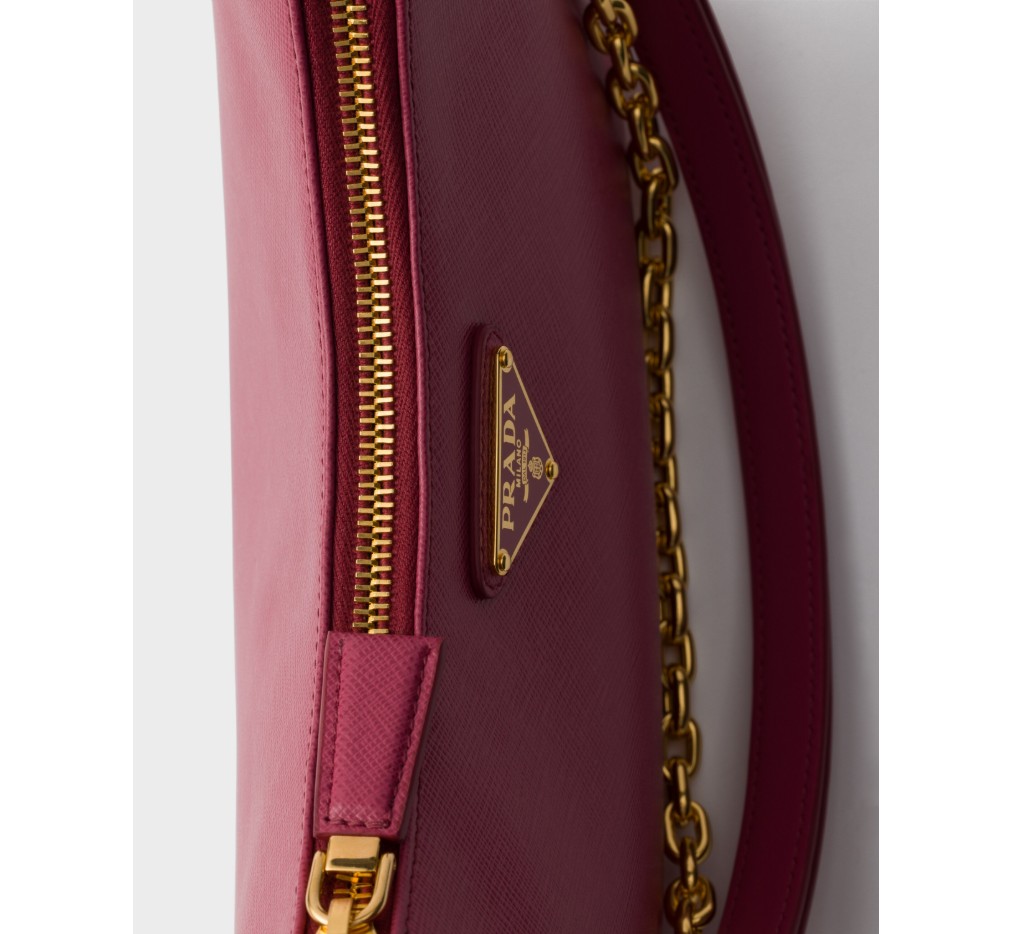 세련된 라인과 아이코닉한 디테일이 돋보이는 이 다재다능한 백은 탈부착 가능한 체인과 가죽 핸들이 특징입니다. 사피아노 가죽 소재의 액세서리는 독특한 에나멜 메탈 삼각형 로고로 장식되어 있습니다. – 제품 코드: 1BC204_NZV_F0XLF_V_QOM