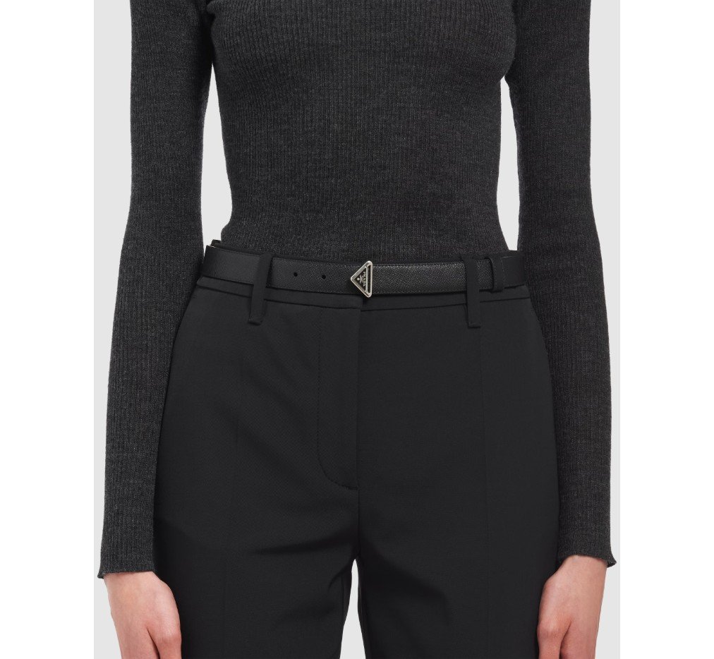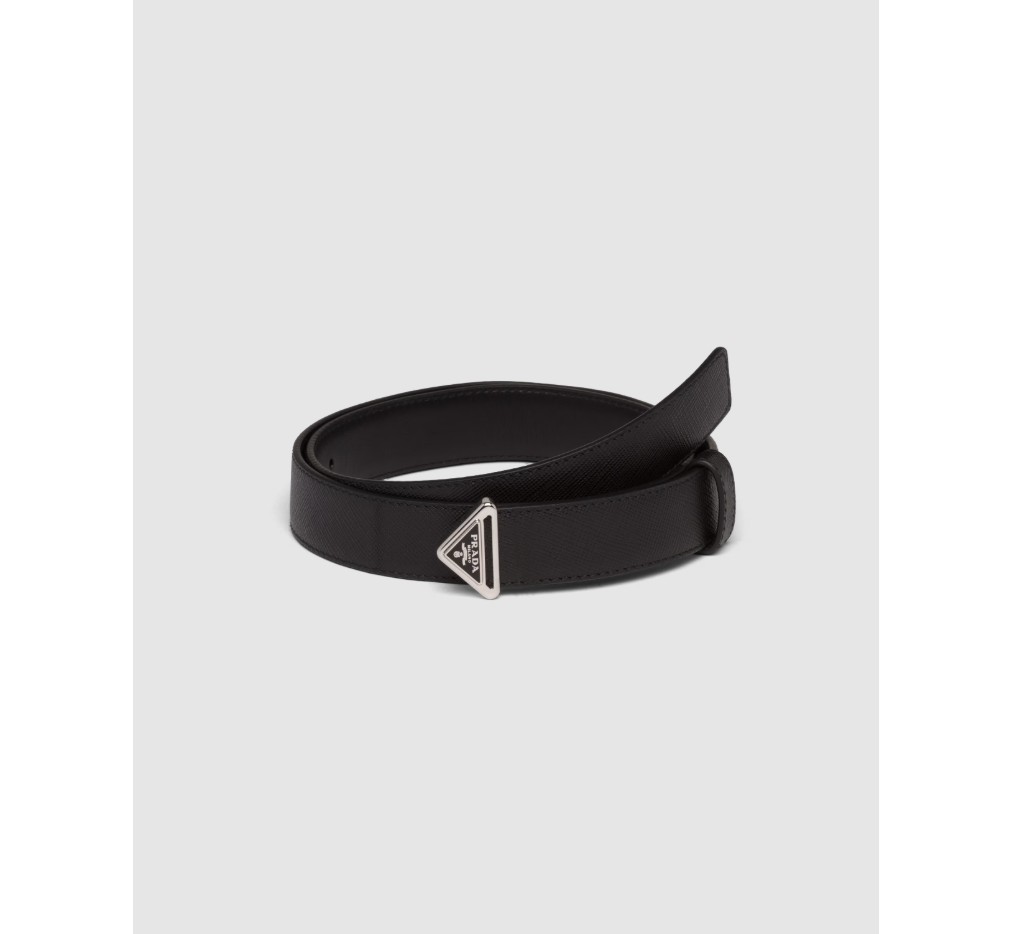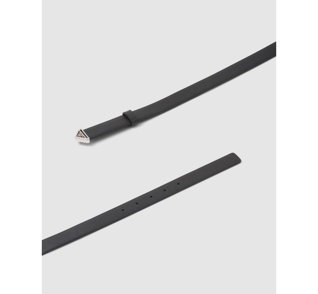1913년 마리오 프라다가 디자인한 트렁크에 처음 등장한 역사적인 에나멜 삼각형 로고는 이 벨트를 완성하는 버클을 변형합니다. 이탈리아 전통 가죽 제조 방식을 대표하는 프라다의 상징적인 소재인 사피아노 가죽은 크로스해치 패턴과 왁스 마감으로 특징지어집니다.