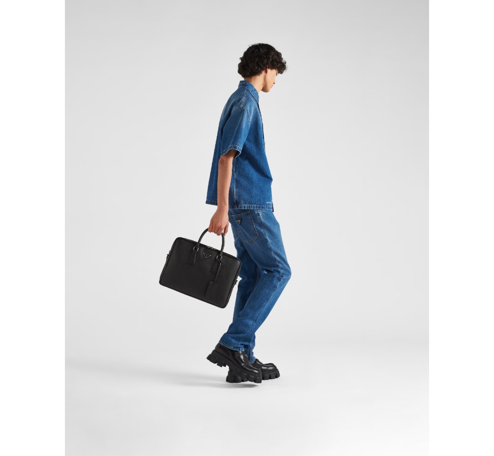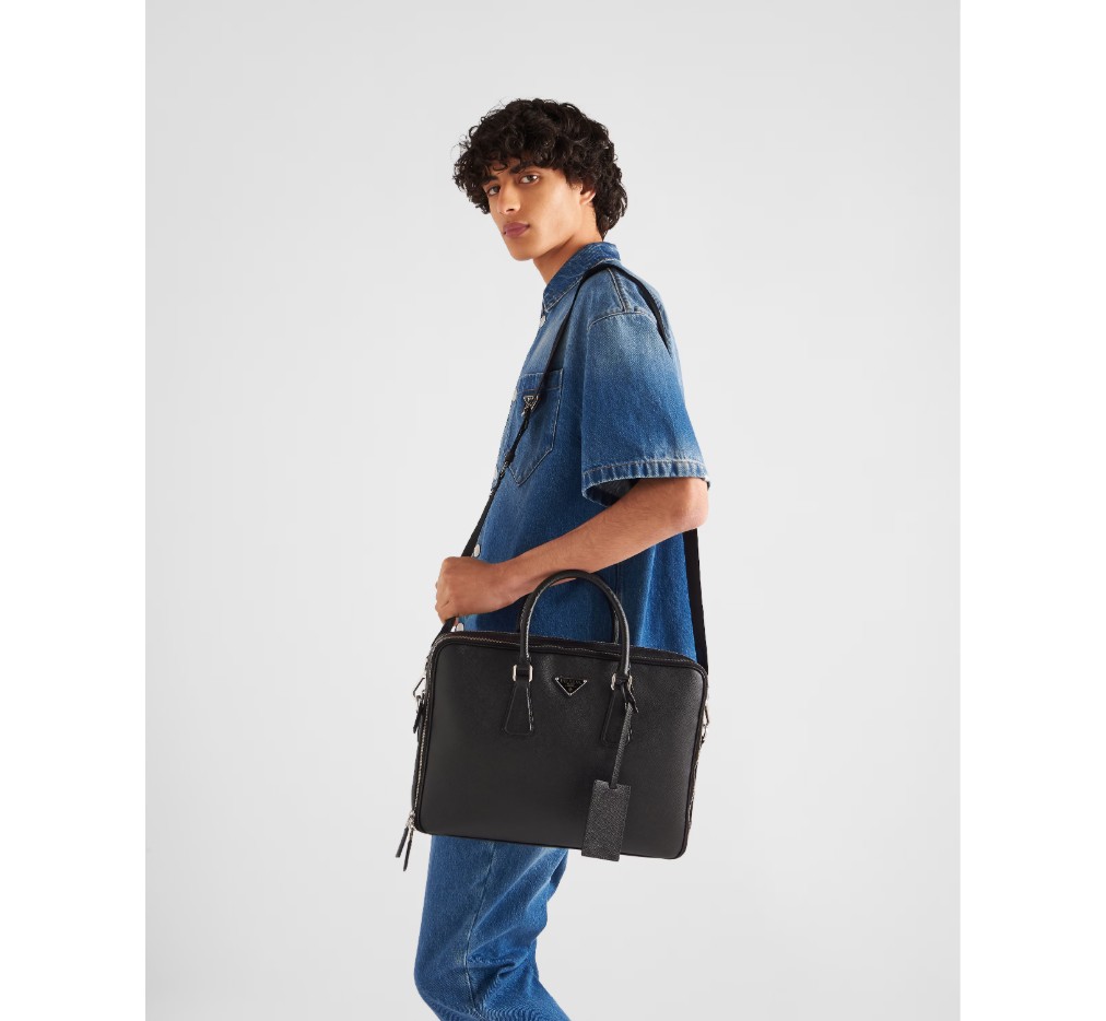 이 우아하고 세련된 브리프케이스는 두 개의 수납공간, 탈부착 가능한 네임택, 다양한 내부 포켓, 그리고 탈부착 가능한 나일론 및 가죽 숄더 스트랩으로 구성된 기능적인 구조가 특징입니다. 브랜드의 상징적인 소재인 사피아노 가죽으로 제작되었으며, 1913년 마리오 프라다가 디자인한 트렁크에 처음 등장했던 상징적인 에나멜 메탈 삼각형 로고가 장식되어 있습니다.