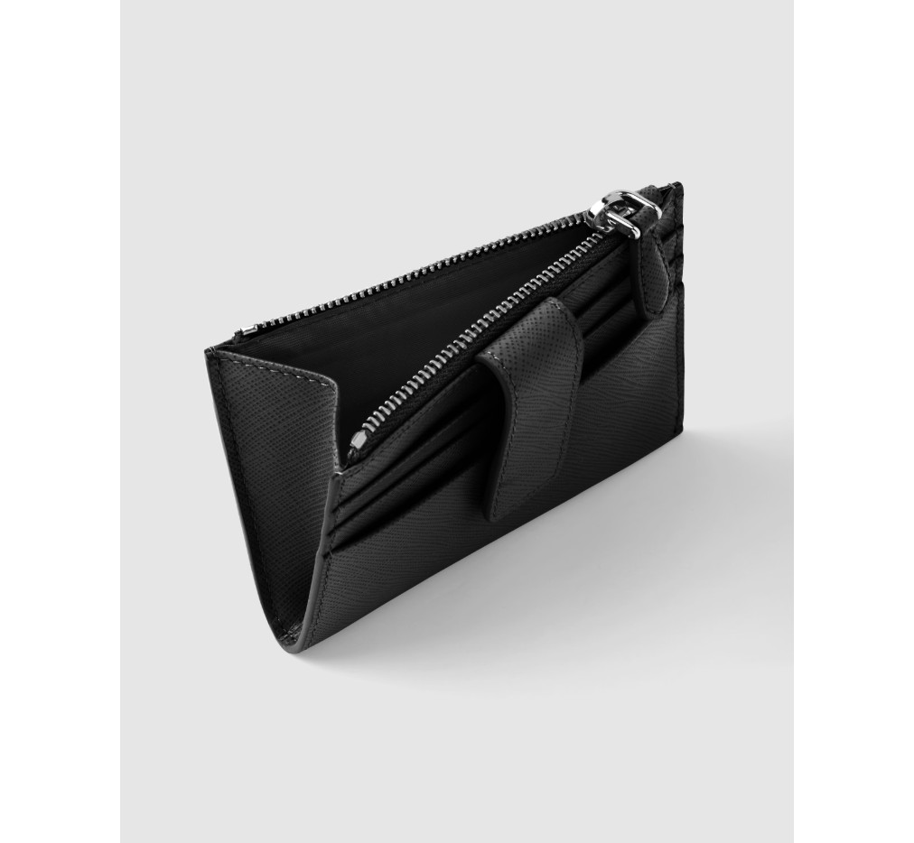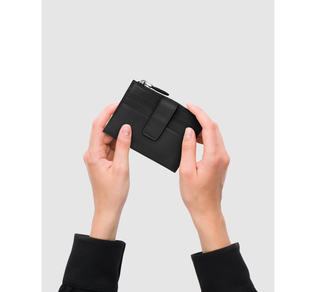 작고 편리한 이 세련된 사피아노 가죽 신용카드 홀더는 상징적인 에나멜 금속 삼각형 로고로 장식되어 있습니다.