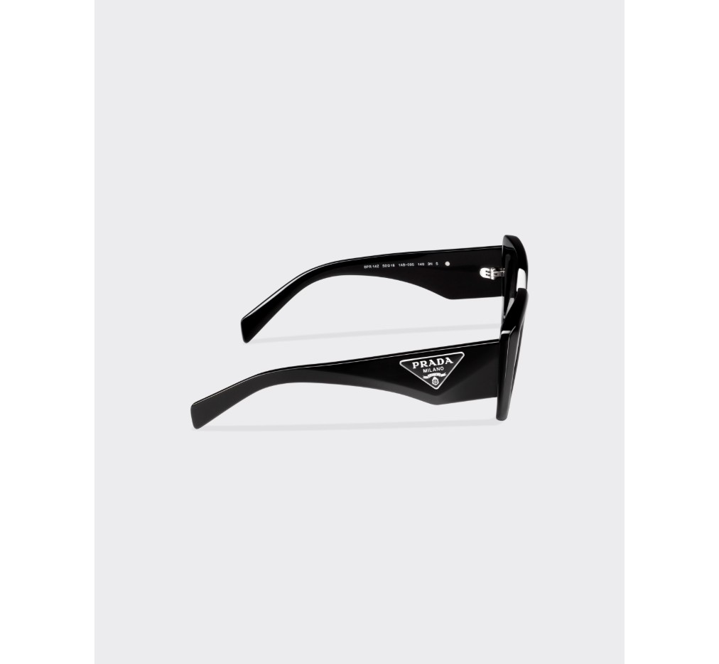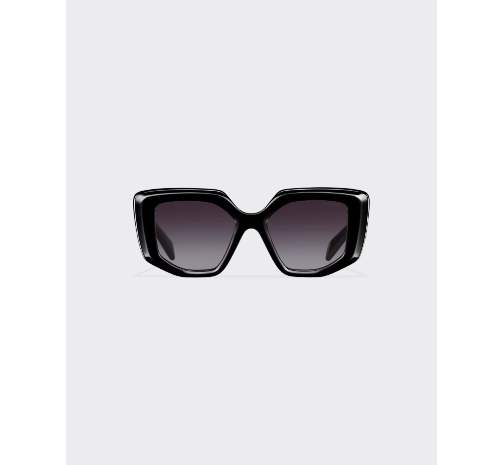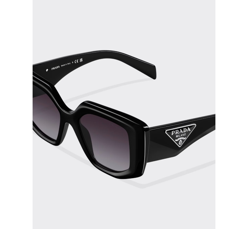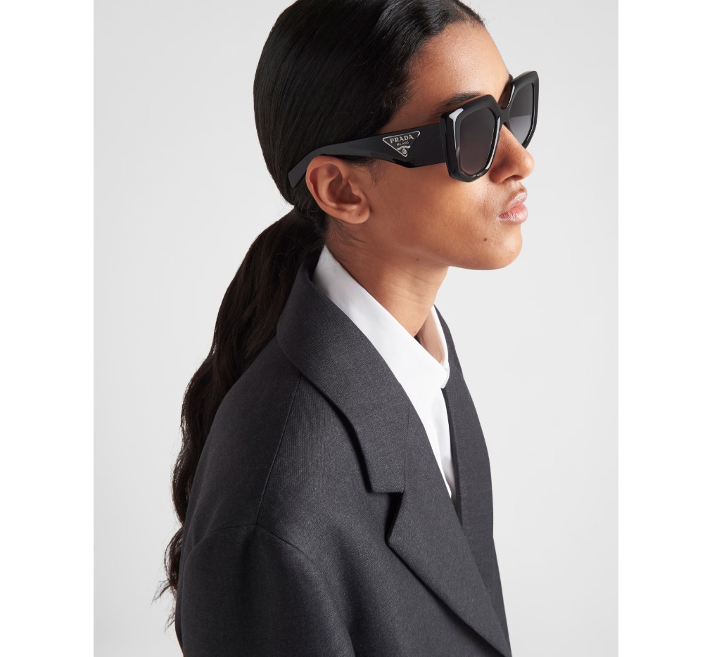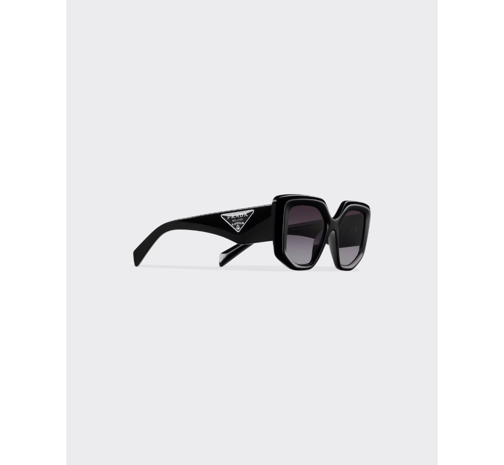 현대적인 여성미를 담은 아세테이트 선글라스. 오버사이즈 프레임의 앞면은 불규칙한 디자인이 특징이며, 각진 림과 대담한 기하학적 라인이 특징입니다. 넓은 템플에는 프라다의 상징적인 삼각형 로고가 새겨진 특별한 메탈 장식이 돋보입니다.