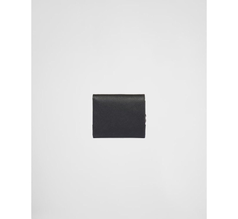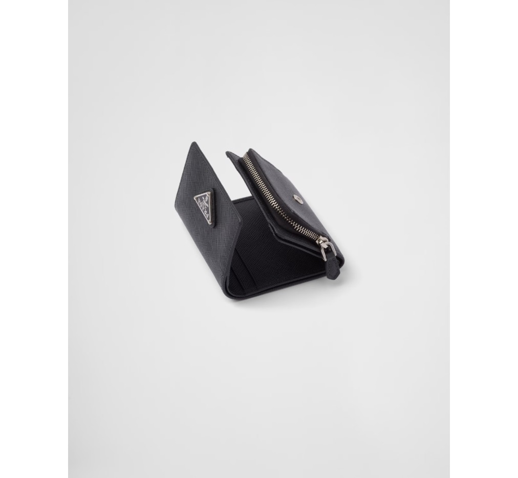 에나멜 메탈 삼각형 로고가 새겨진 사피아노 가죽 지갑은 세련되고 우아한 분위기를 자아냅니다. 깔끔한 라인의 이 지갑은 지퍼 동전 수납공간, 지폐 수납공간, 카드 슬롯을 갖추고 있습니다.