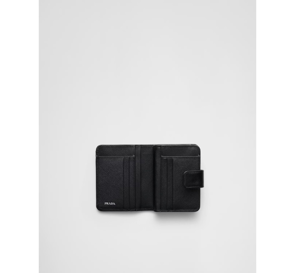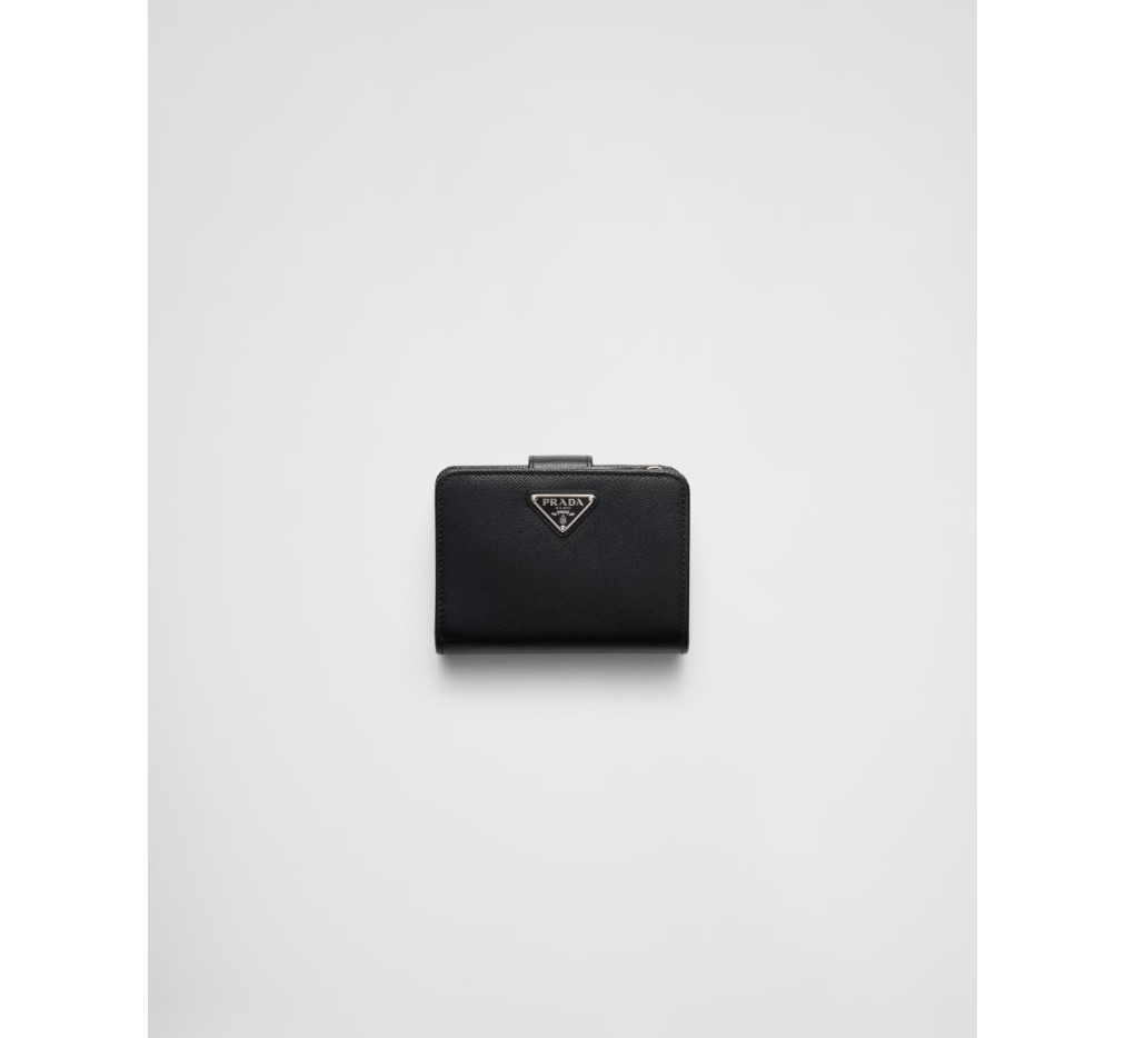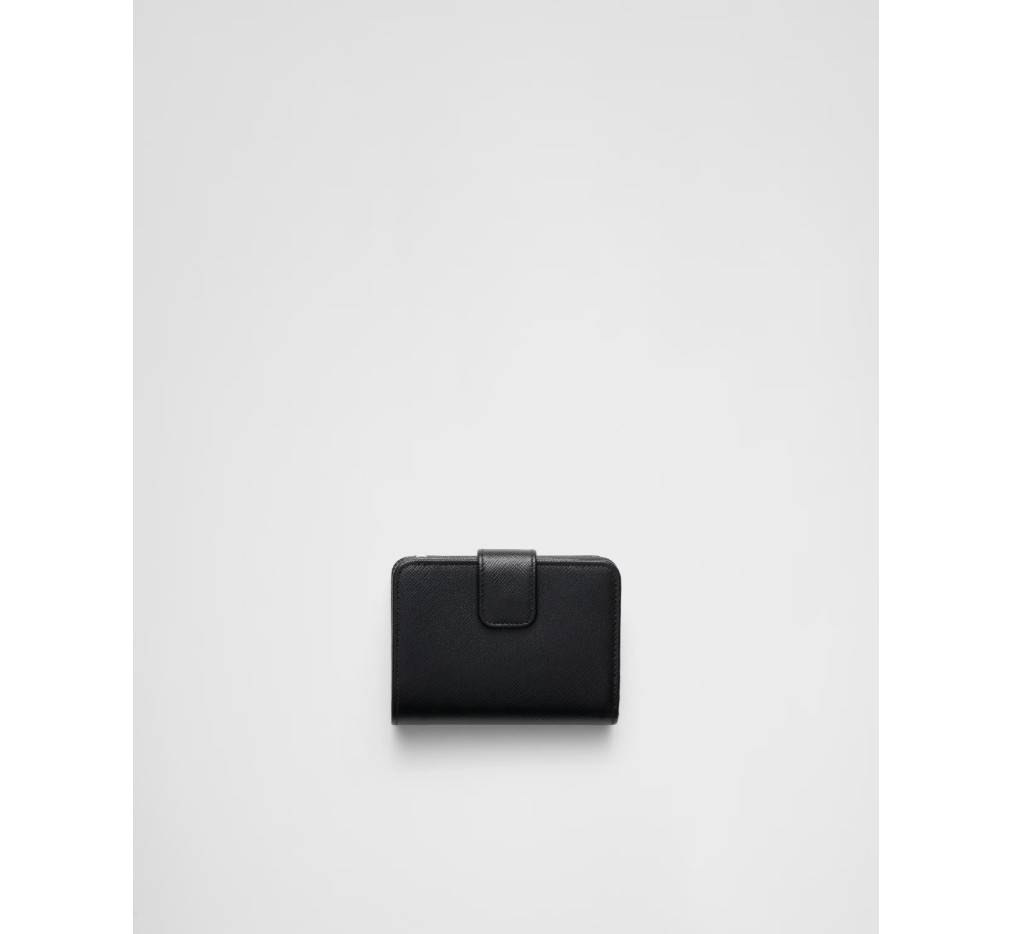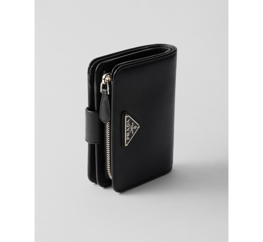 스몰 사이즈지만 실용성은 뛰어난 이 사피아노 가죽 지갑은 9개의 카드 슬롯과 2개의 포켓을 갖추고 있습니다. 에나멜 삼각형 로고가 장식되어 있으며 스냅 잠금 방식을 사용합니다.
