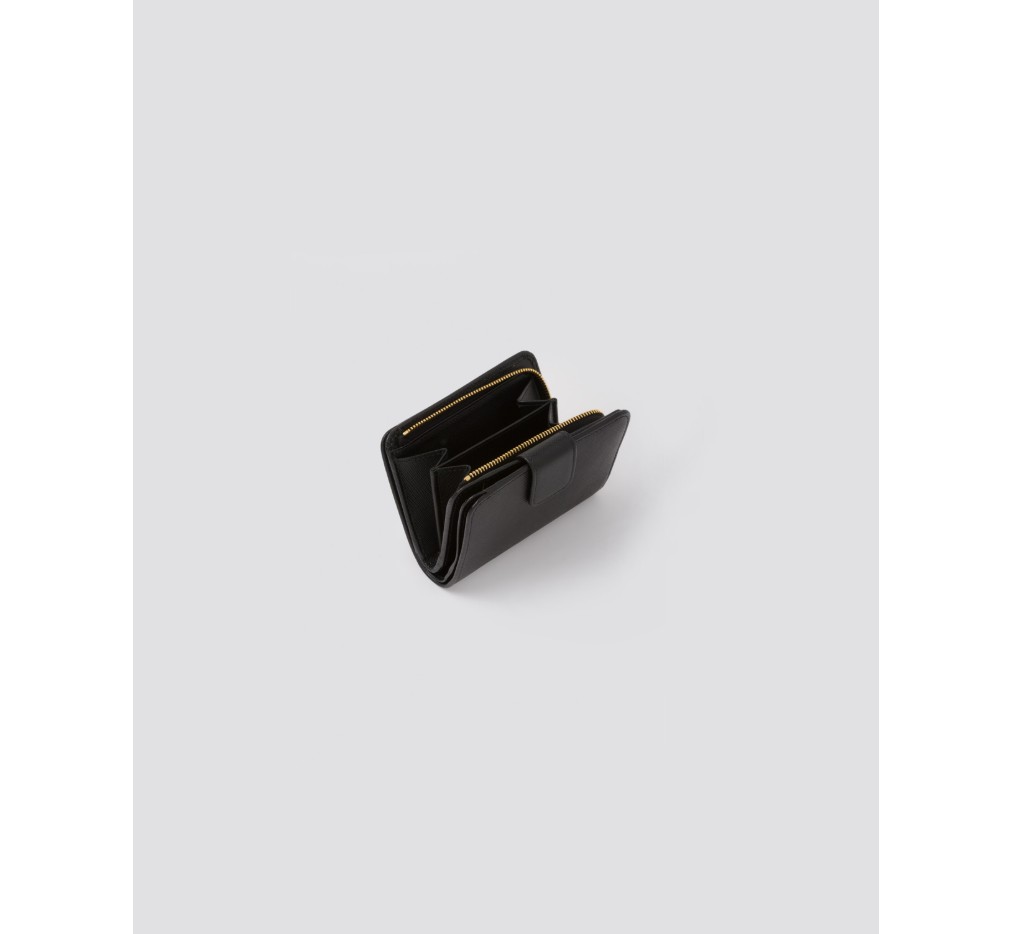 이 우아한 사피아노 가죽 지갑은 메탈 로고와 메탈 하드웨어로 장식되어 있습니다. 지퍼 동전 수납공간, 카드 슬롯, 그리고 내부에 포켓이 있습니다.