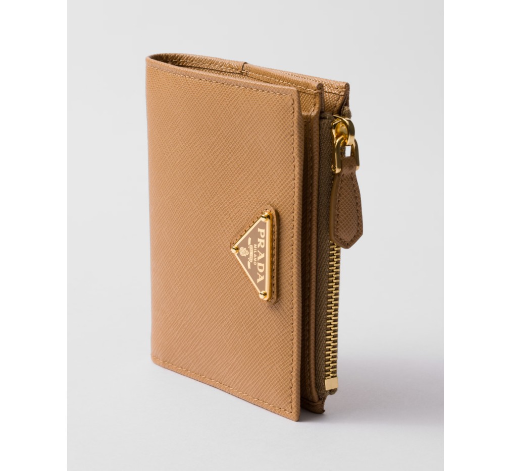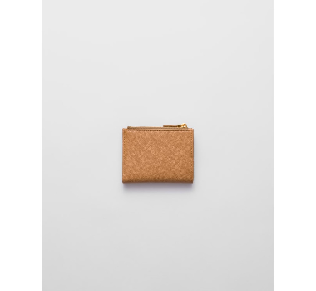 에나멜 메탈 삼각형 로고가 새겨진 사피아노 가죽 지갑은 세련되고 우아한 분위기를 자아냅니다. 깔끔한 라인의 이 지갑은 지퍼 동전 수납공간, 지폐 수납공간, 카드 슬롯을 갖추고 있습니다.