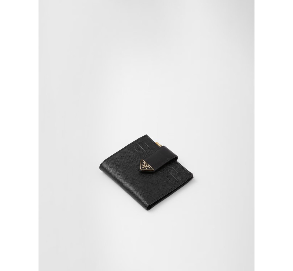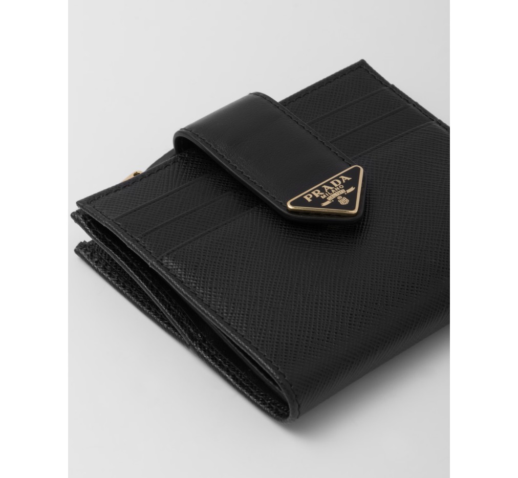 세련되고 고급스러운 매력을 지닌 이 지갑은 카드 슬롯이 눈에 띄며, 매끄러운 가죽과 크로스해치 텍스처의 프라다를 상징하는 사피아노 가죽으로 다양한 디테일을 더했습니다. 미니멀한 디자인이 특징이며, 잠금장치에는 브랜드의 상징적인 에나멜 삼각형 로고가 장식되어 있습니다.