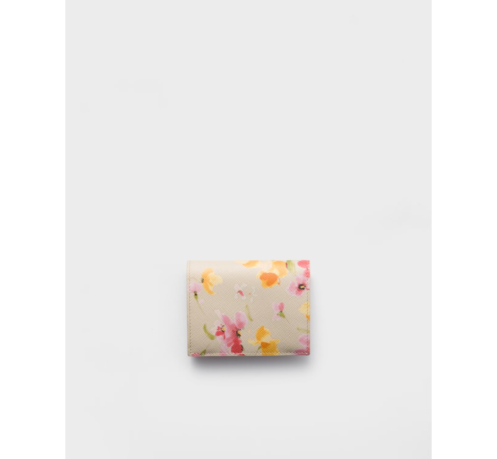 로맨틱한 플로럴 프린트가 클래식한 라인으로 사피아노 가죽 지갑을 더욱 돋보이게 합니다. 세련되고 실용적인 이 지갑에는 여러 개의 포켓과 내부 동전 포켓이 있습니다. 에나멜 처리된 메탈 삼각형 로고가 독특한 분위기를 더합니다.