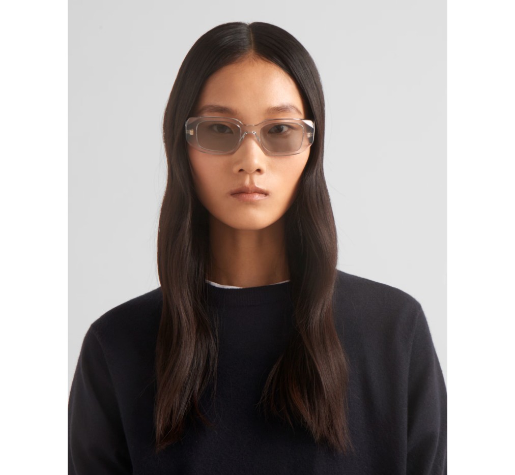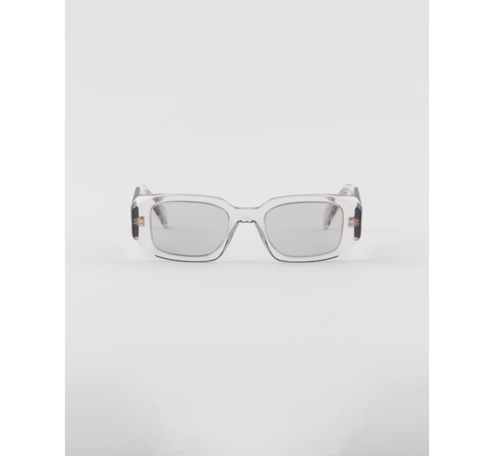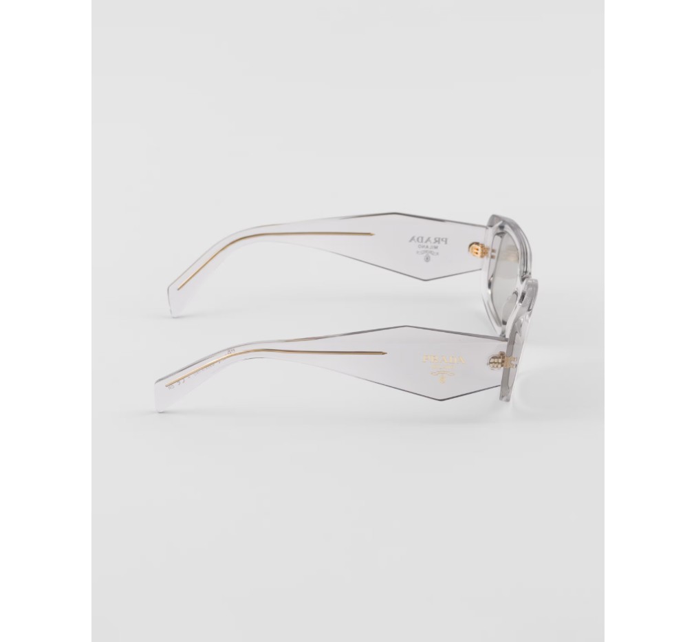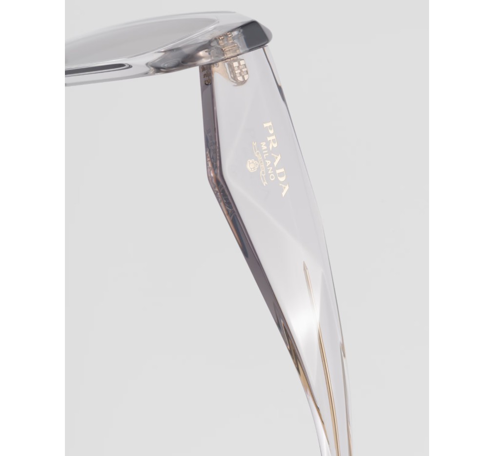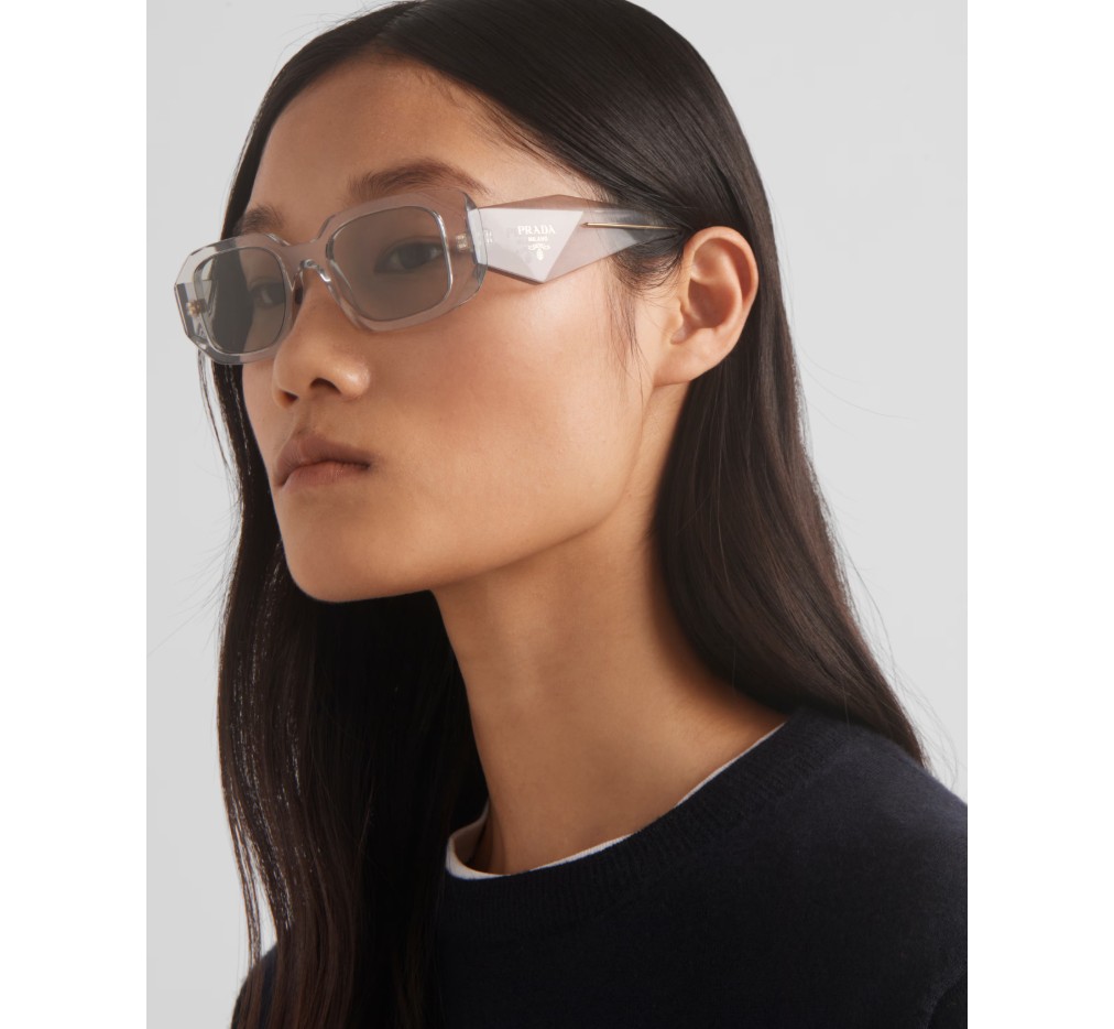 기하학적인 디자인과 풍성한 볼륨감이 돋보이는 아세테이트 선글라스입니다. 과감한 프레임 앞면은 바깥쪽 가장자리의 극단적인 각도 컷으로 아방가르드한 림을 강조합니다. 템플의 입체적인 디자인은 전통적인 프라다 삼각형 로고를 도안화하여 표현했습니다.
