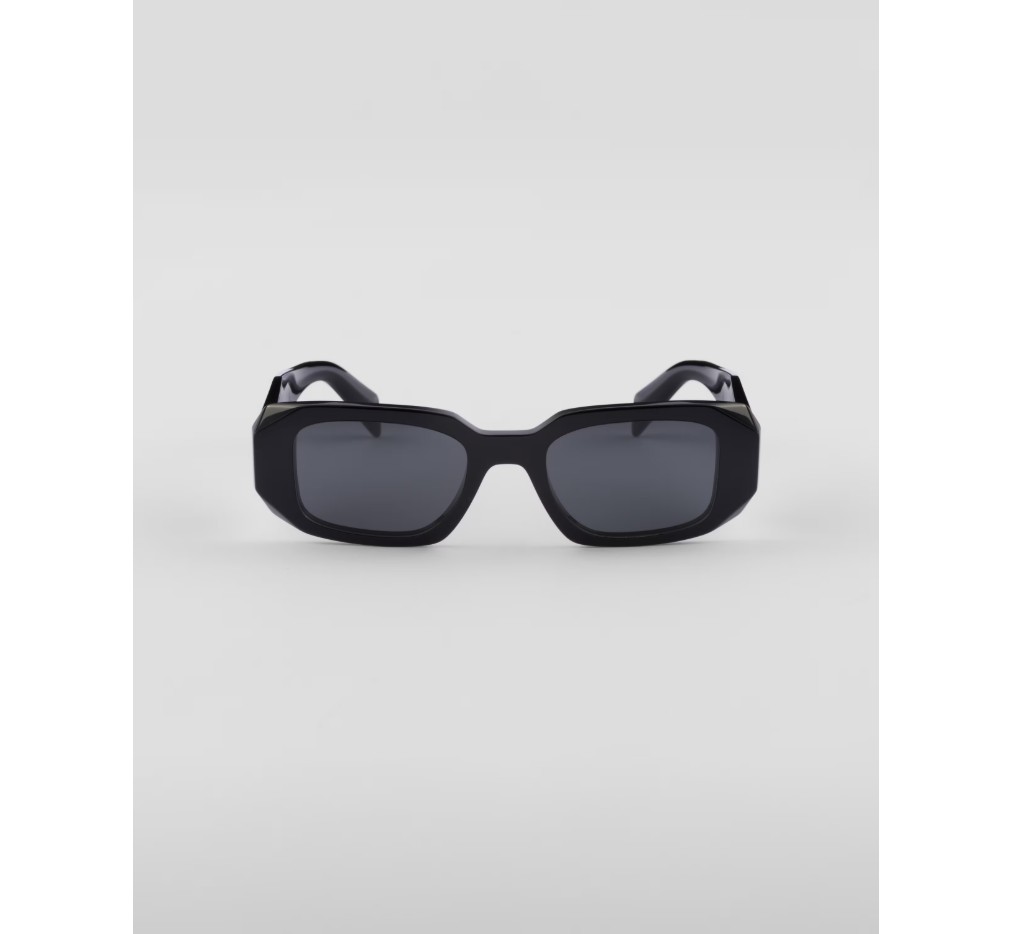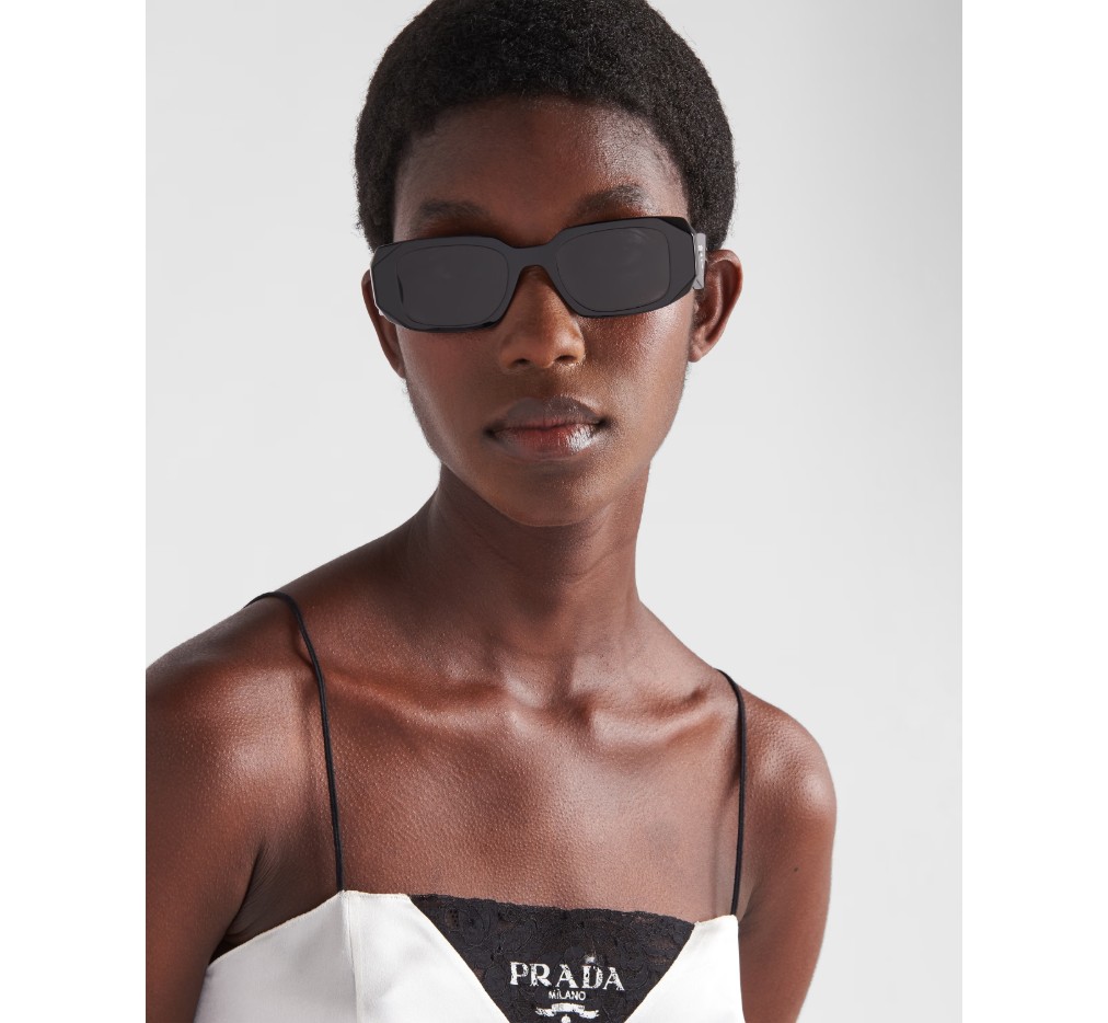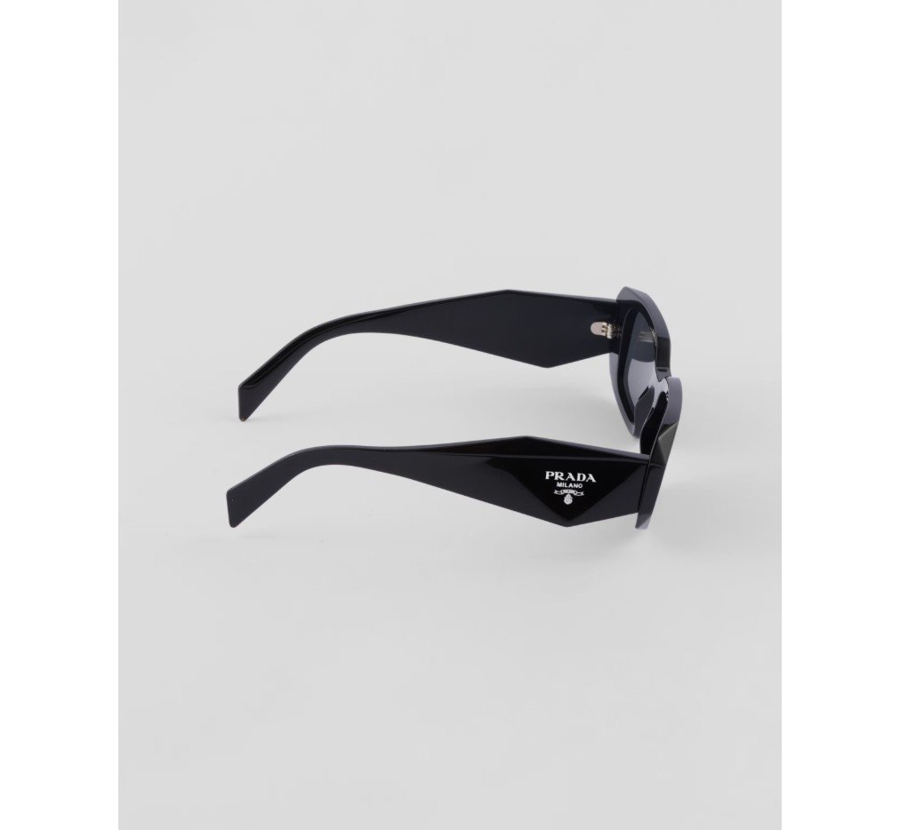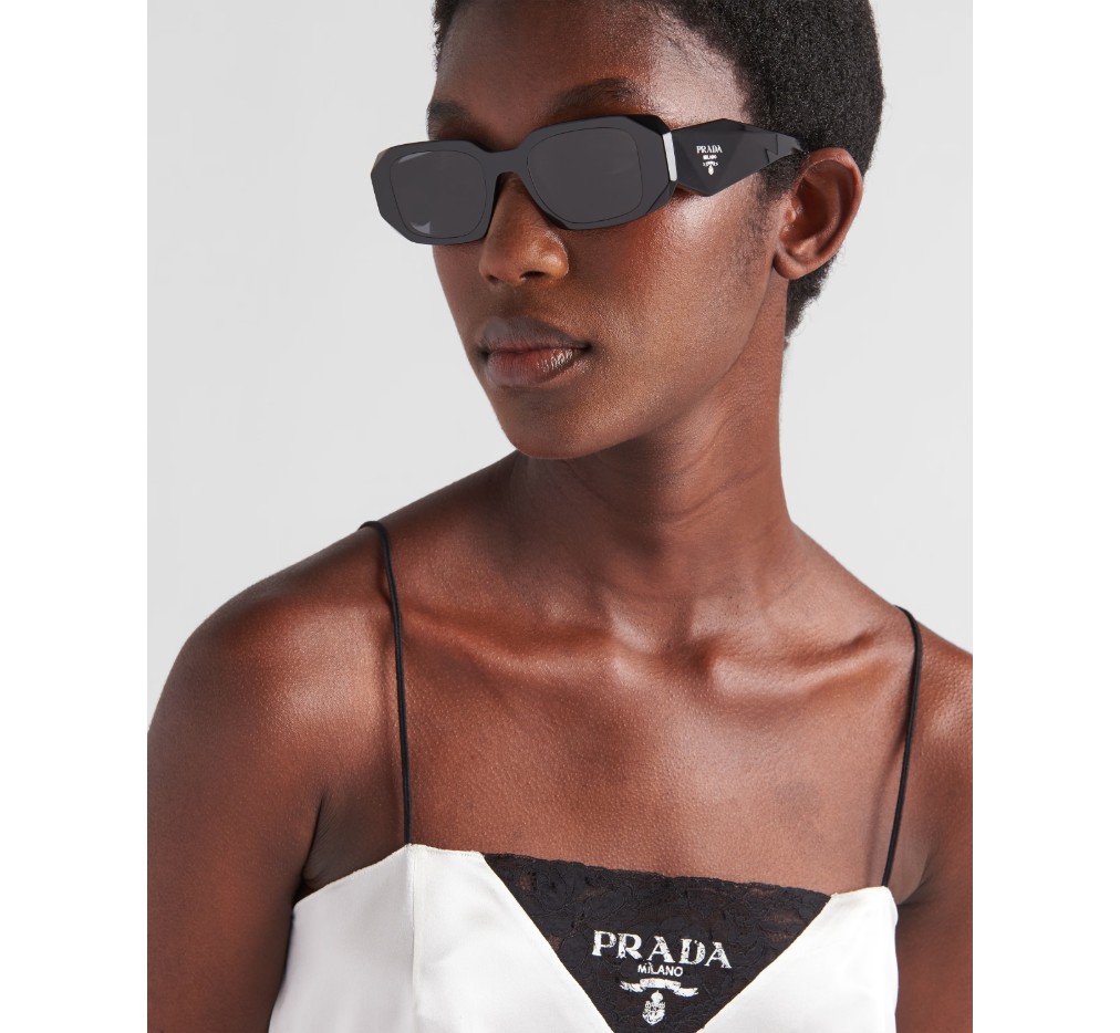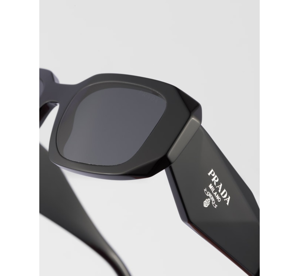 오버사이즈의 기하학적 디자인이 돋보이는 아세테이트 선글라스입니다. 과감한 프레임 전면은 바깥쪽 모서리를 극단적으로 각지게 커팅하여 아방가르드한 실루엣을 완성합니다. 3차원 템플 디자인은 전통적인 프라다 삼각형 로고를 아이코노그래픽하게 재해석하여 장식했습니다.