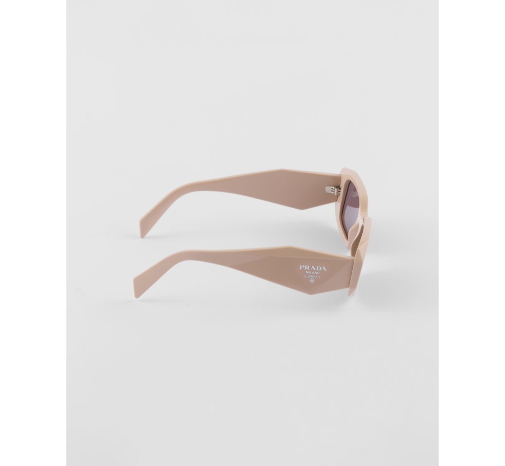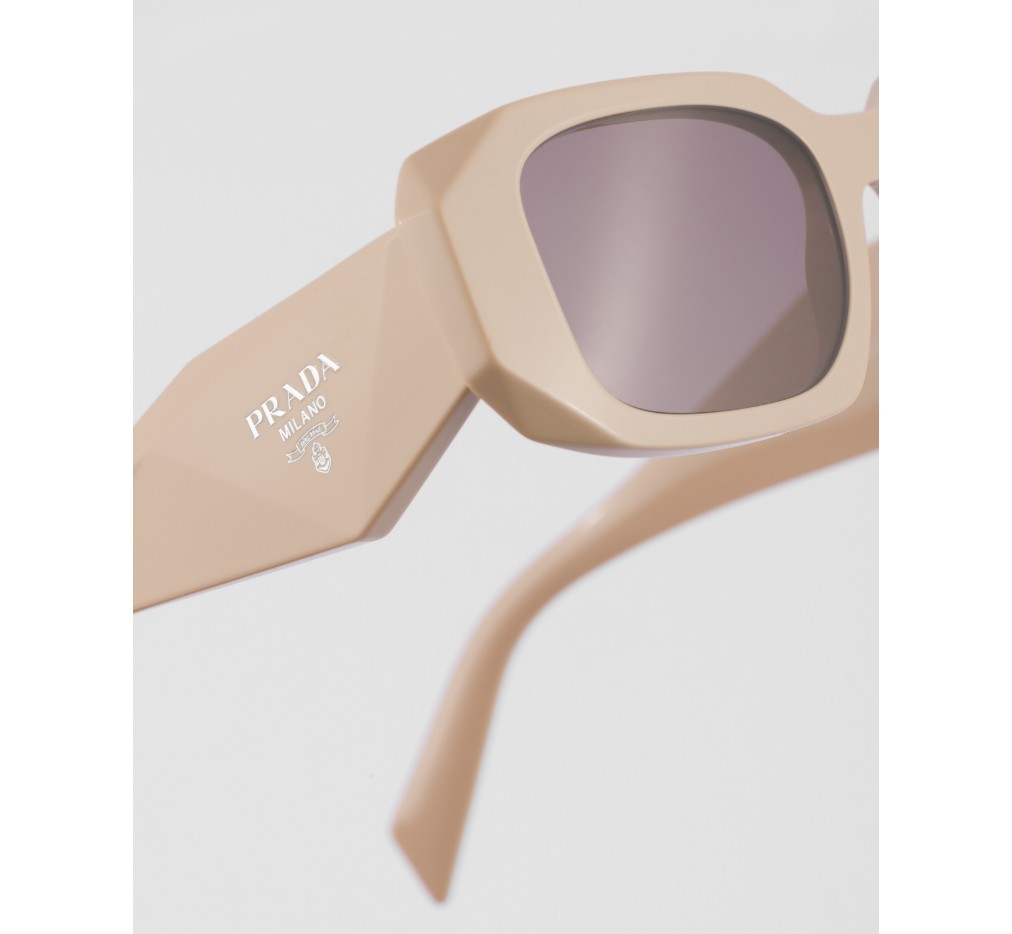 오버사이즈의 기하학적 디자인이 돋보이는 아세테이트 선글라스입니다. 과감한 프레임 앞면은 바깥쪽 모서리를 극단적으로 각지게 커팅하여 아방가르드한 실루엣을 완성합니다. 템플의 입체적인 디자인은 프라다의 전통적인 삼각형 로고를 도안화하여 장식했습니다.