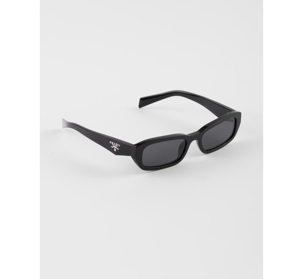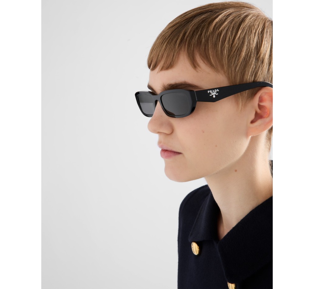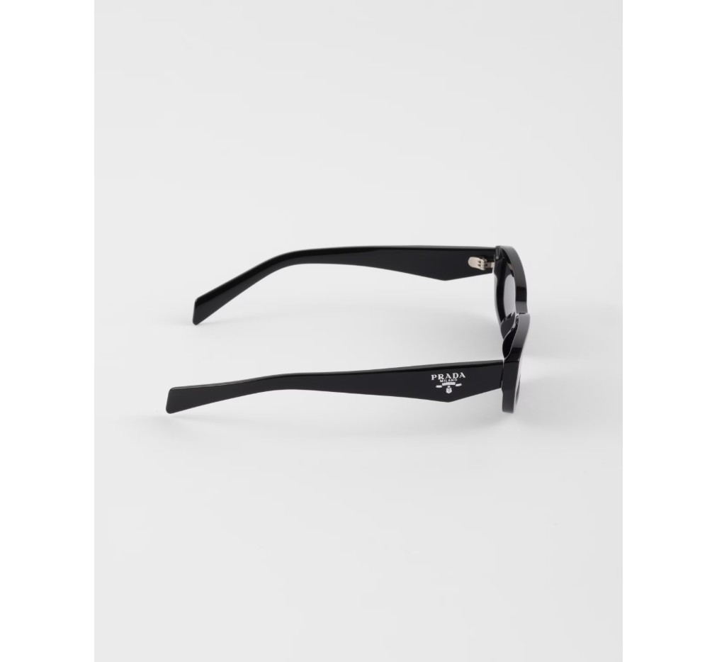면 처리된 림과 기하학적인 라인이 특징인 아세테이트 선글라스. 템플은 아이코닉한 삼각형 로고를 더욱 돋보이게 하는 정교한 입체적 기법을 특징으로 합니다.