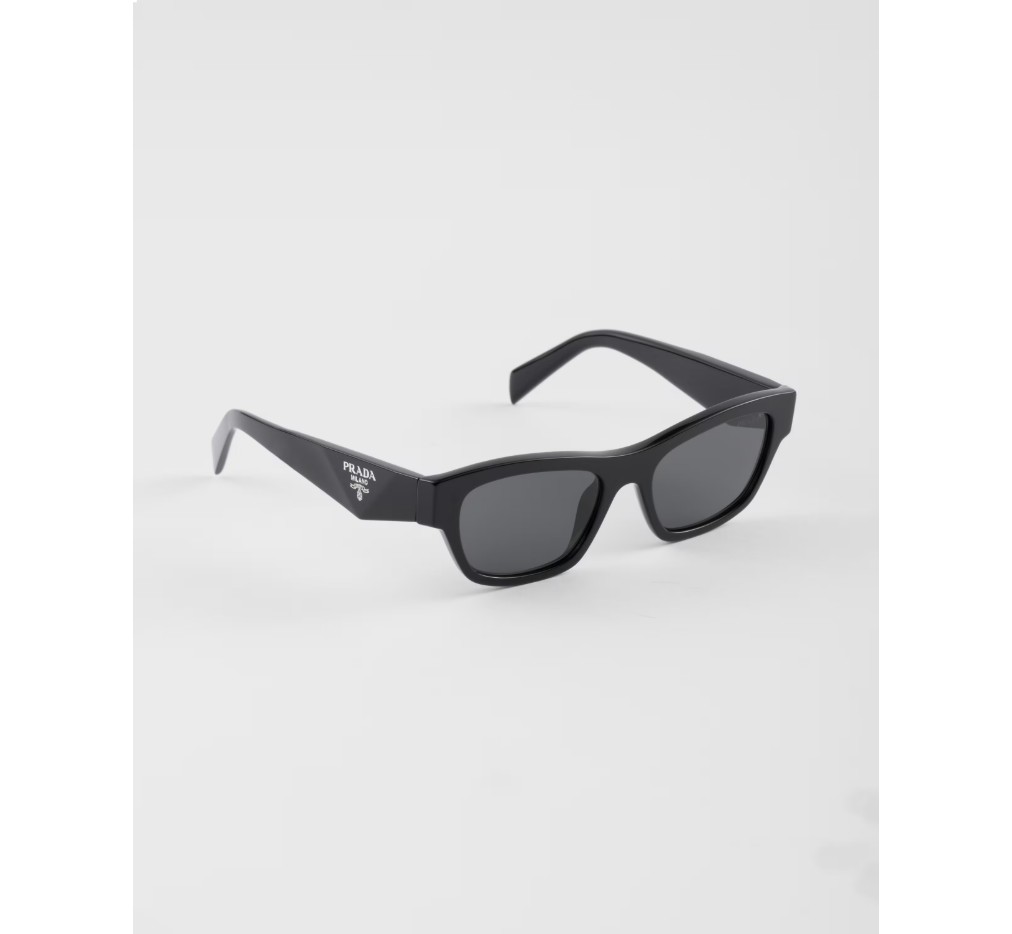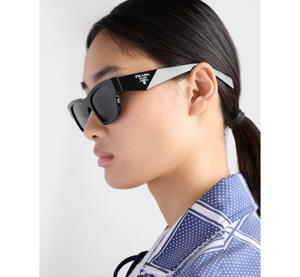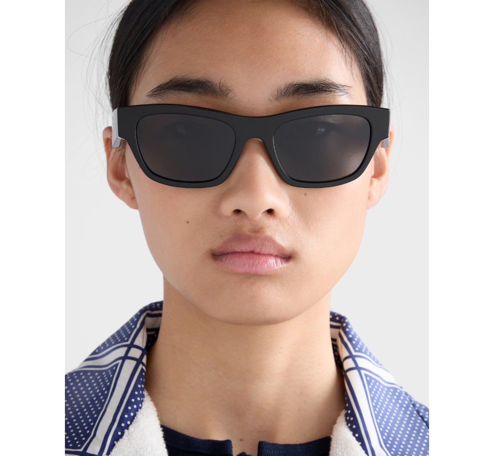 사각형의 두툼한 디자인이 특징인 아세테이트 선글라스. 템플은 삼각형 로고를 상징적으로 표현한 정교한 입체적 기법이 특징입니다.