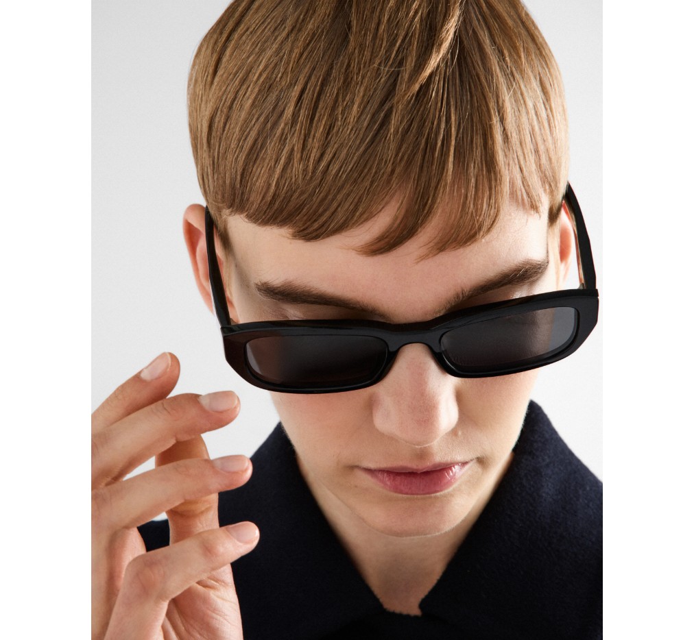 면 처리된 림과 기하학적인 라인이 특징인 아세테이트 선글라스. 템플은 아이코닉한 삼각형 로고를 더욱 돋보이게 하는 정교한 입체적 기법을 특징으로 합니다.
