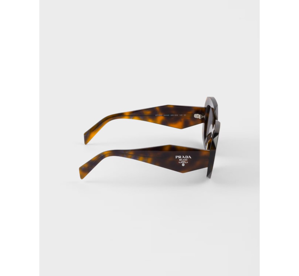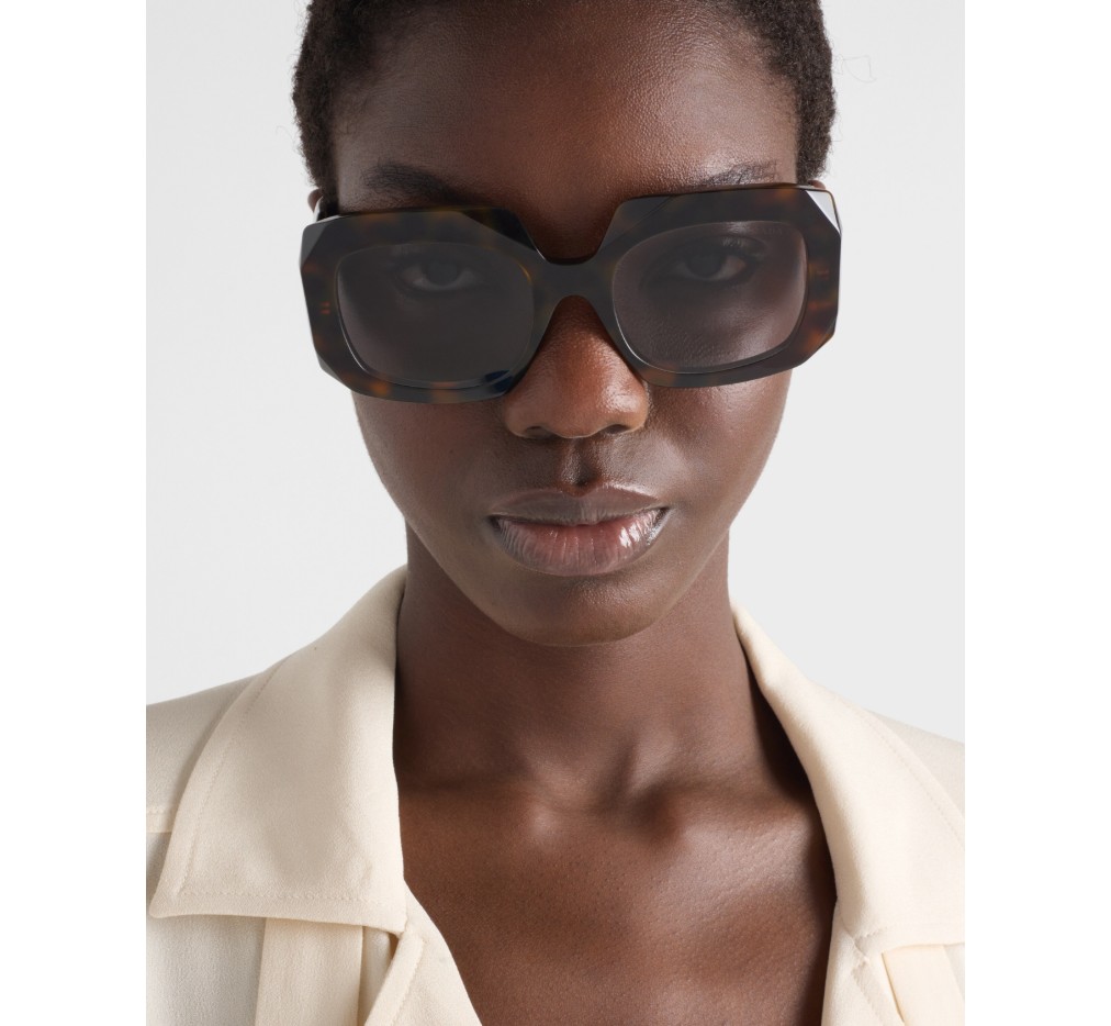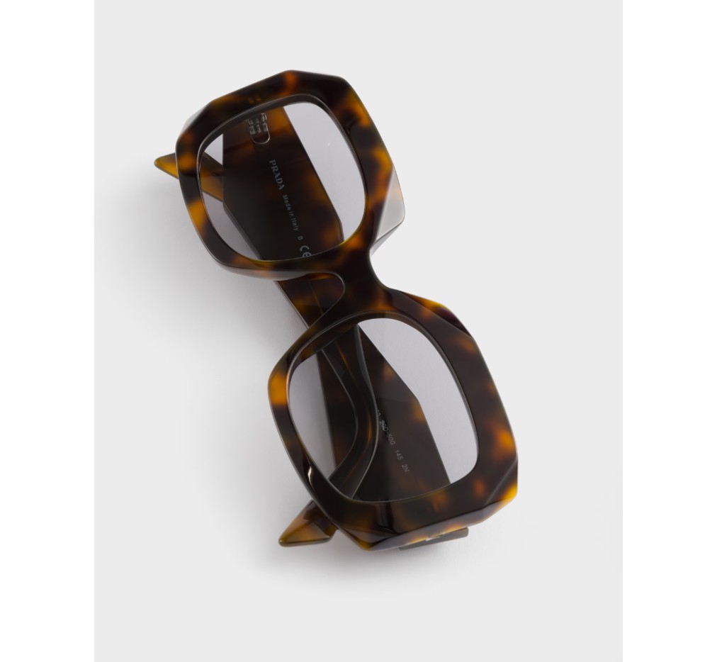 기하학적인 디자인과 볼륨감이 돋보이는 아세테이트 선글라스입니다. 과감한 프레임은 날카롭게 경사진 외부 테두리로 이루어진 오버사이즈 사각형 앞면을 특징으로 합니다. 템플의 입체적인 디테일은 프라다의 전통적인 삼각형 로고를 도안화하여 표현했습니다.