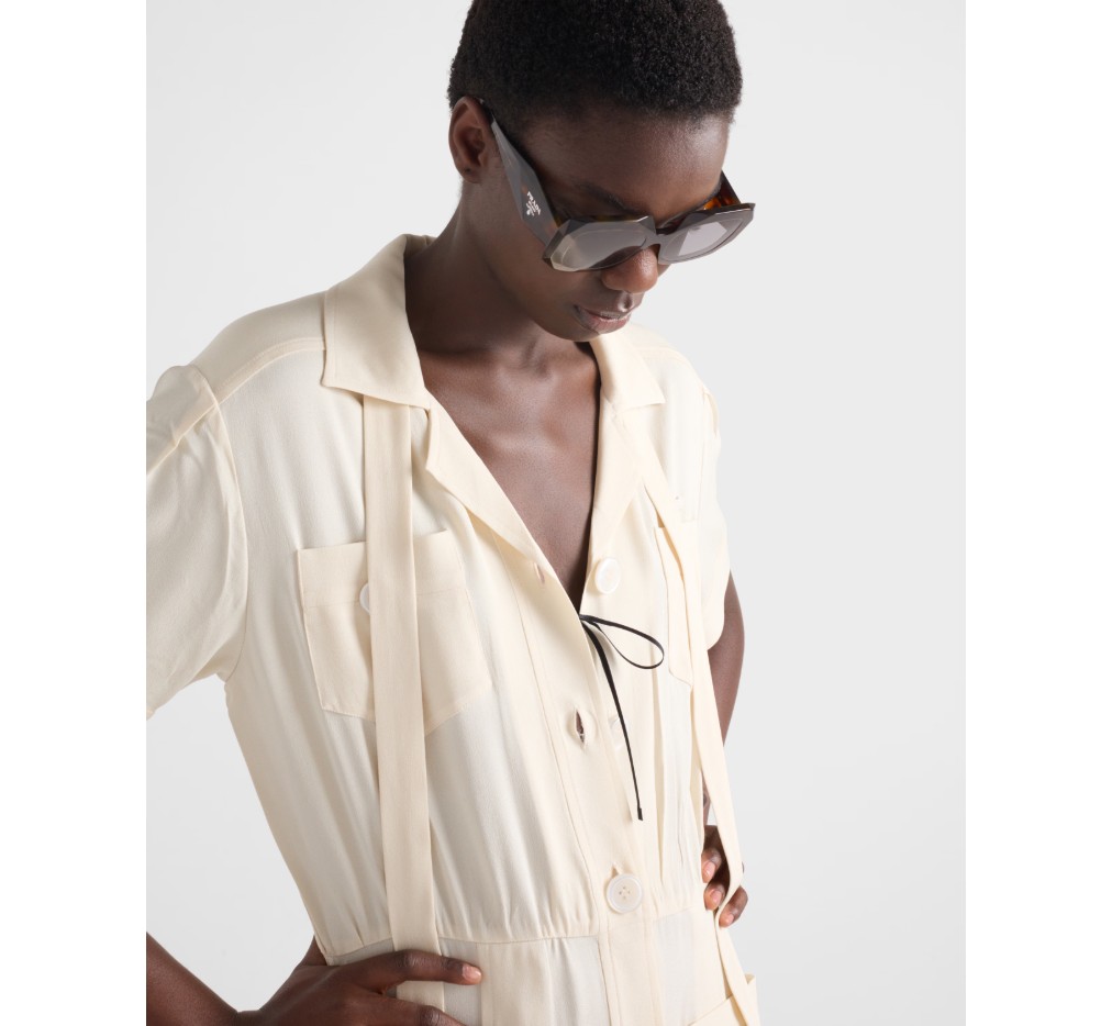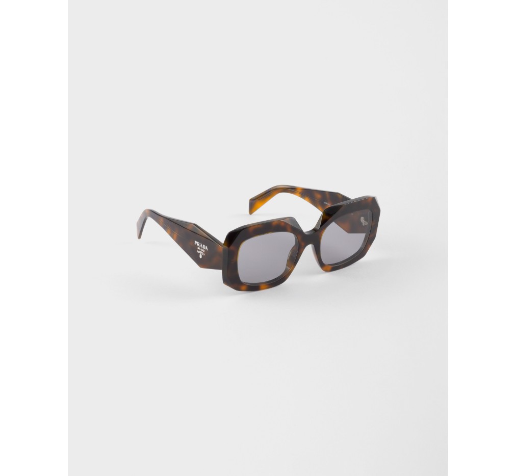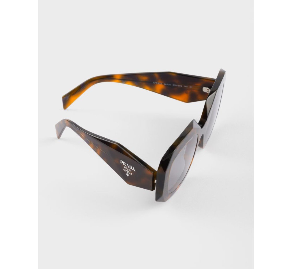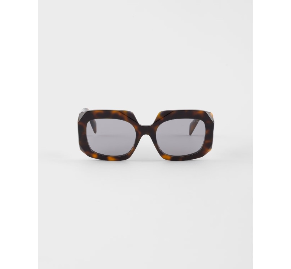기하학적인 디자인과 볼륨감이 돋보이는 아세테이트 선글라스입니다. 과감한 프레임은 날카롭게 경사진 외부 테두리로 이루어진 오버사이즈 사각형 앞면을 특징으로 합니다. 템플의 입체적인 디테일은 프라다의 전통적인 삼각형 로고를 도안화하여 표현했습니다.