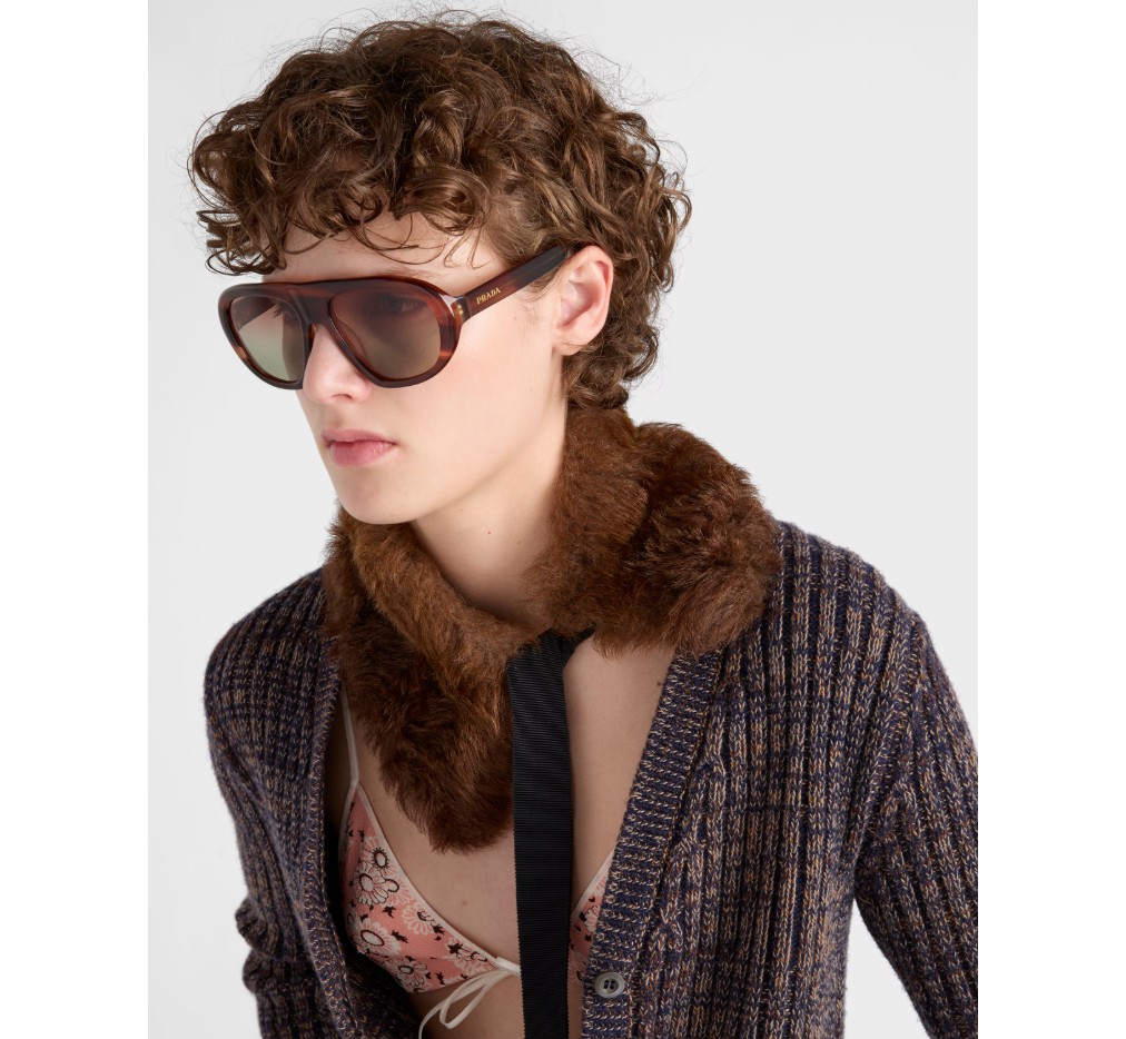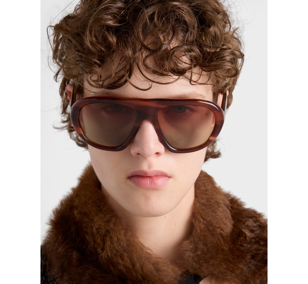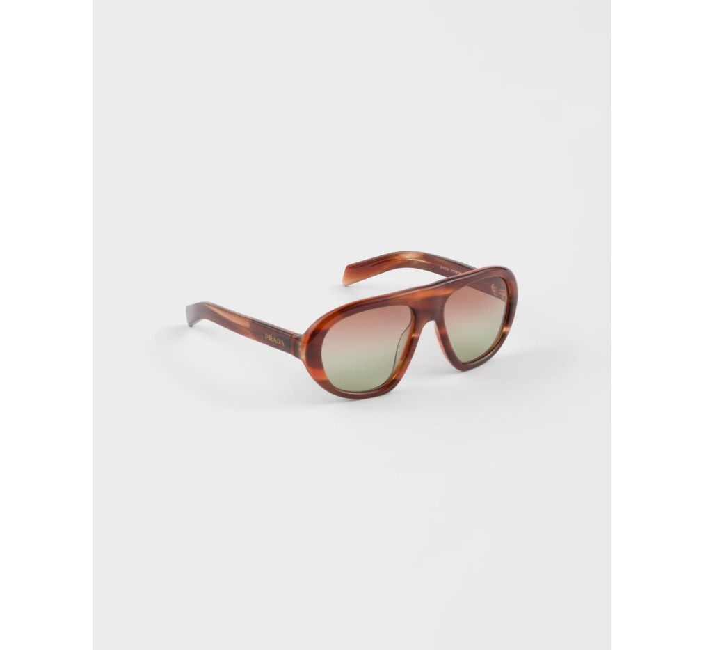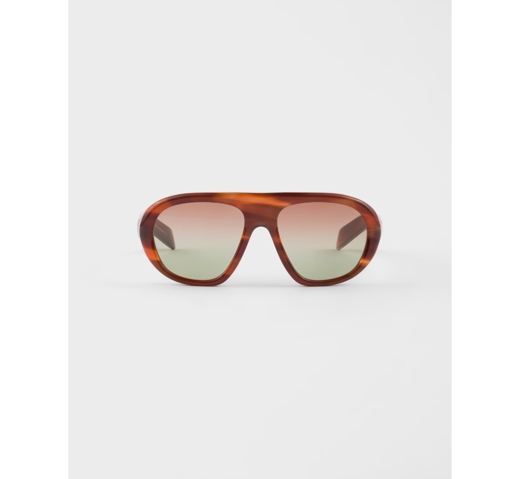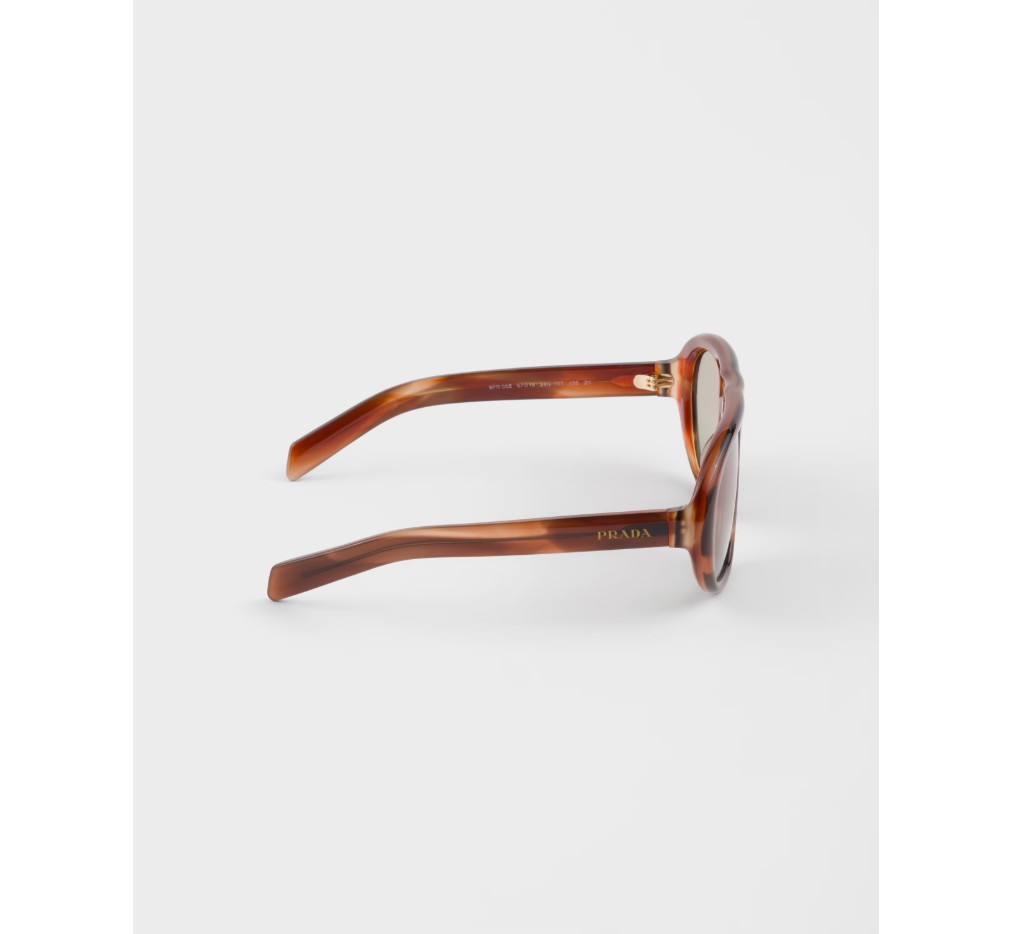 오버사이즈 디자인의 아세테이트 선글라스입니다. 프레임은 오버사이즈 파일럿 실루엣과 라지 볼륨감을 특징으로 하여 현대적이고 여성스러운 느낌을 선사합니다. 곡선형 템플에는 에나멜 처리된 프라다 로고가 장식되어 있습니다.