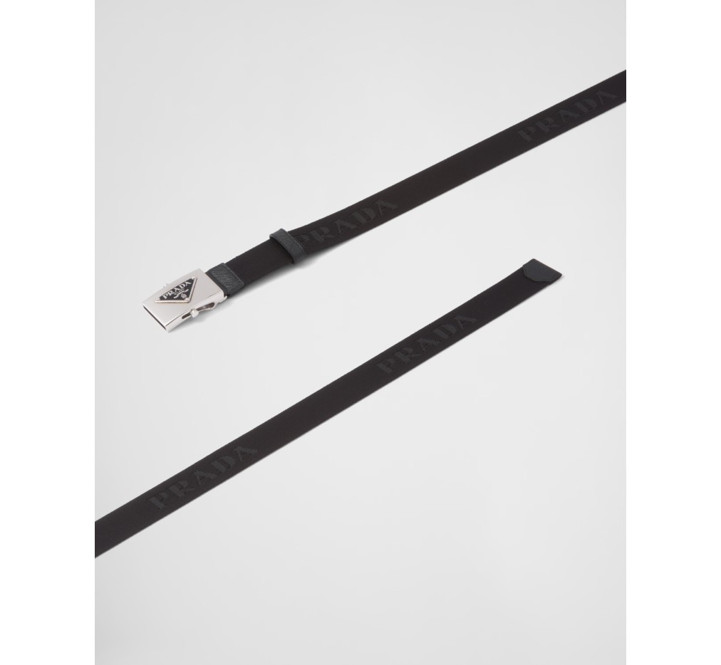 라지 톤의 레터링 로고로 장식된 이 나일론 벨트는 브랜드의 상징적인 에나멜 처리된 금속 삼각형 로고가 있는 박스 버클이 특징입니다. 이 제품은 '바다 너머(Sea Beyond)' 교육 프로그램에 기여하지 않습니다. – 제품 코드: 2CN085_2DKF_F0002