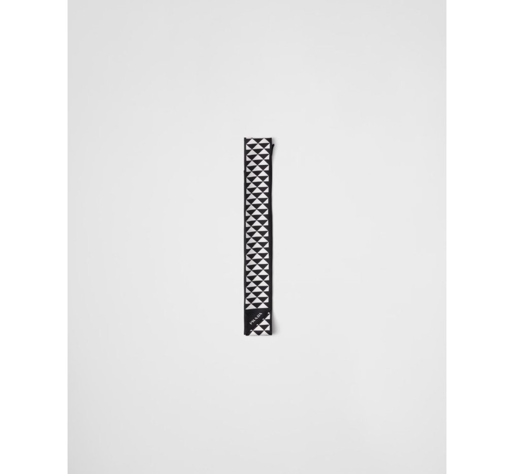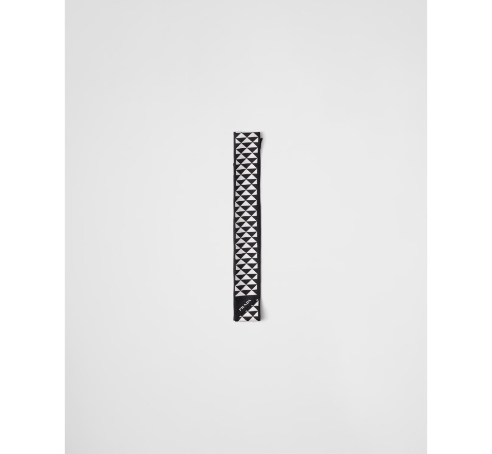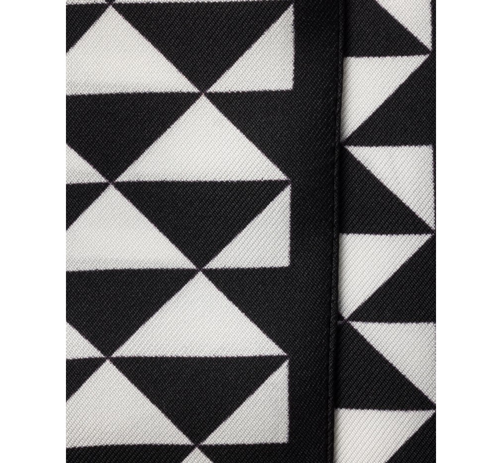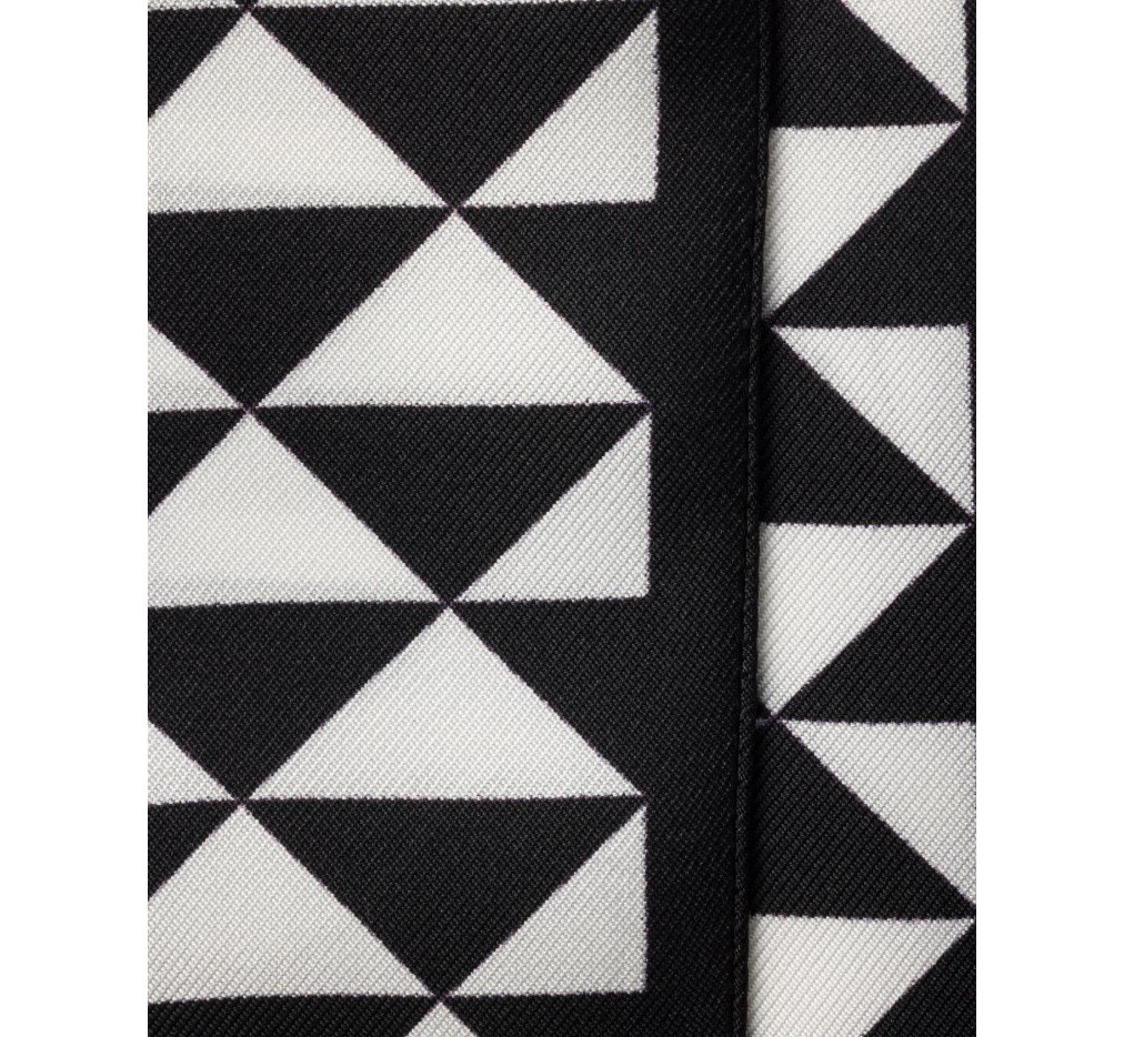 프라다의 상징적인 심볼 프린트는 매끄러운 삼각형 라인을 현대적인 기하학적 패턴으로 변형시켜 고급 실크 능직으로 만든 이 얇은 스카프를 장식합니다.