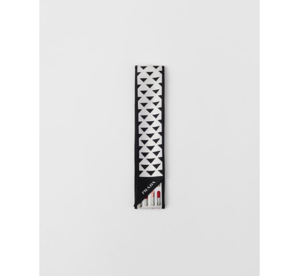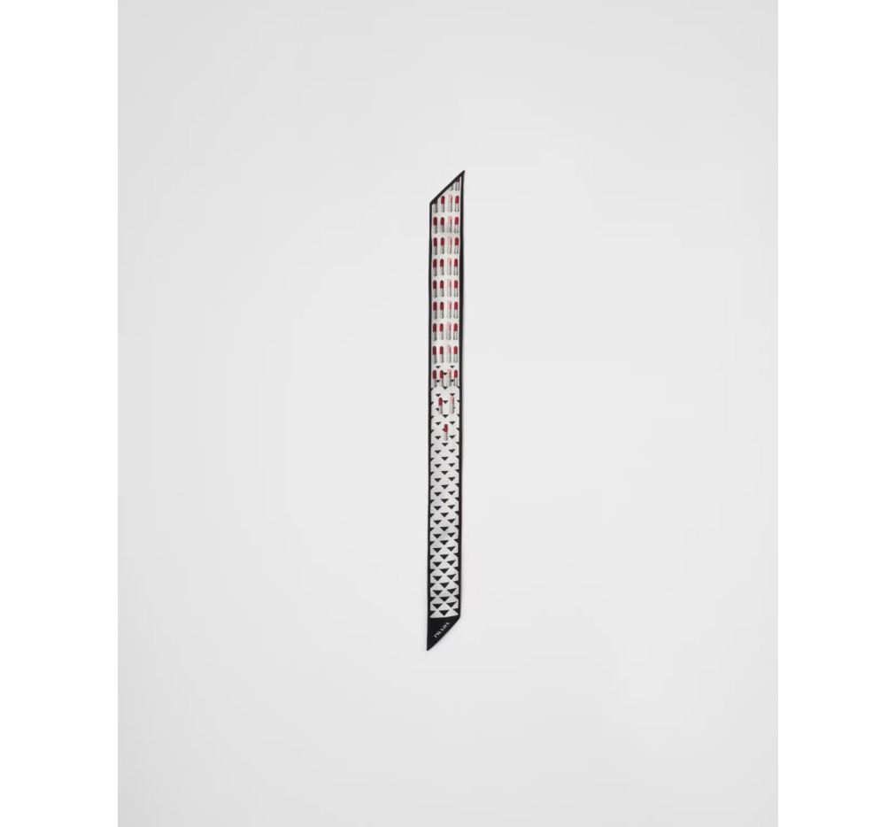 프라다 코드를 완벽하게 표현한 이 실크 스키니 스카프는 상징적이고 세련된 아카이브 프린트와 결합된 음영 처리된 기하학적 모티브로 생동감을 더했습니다.