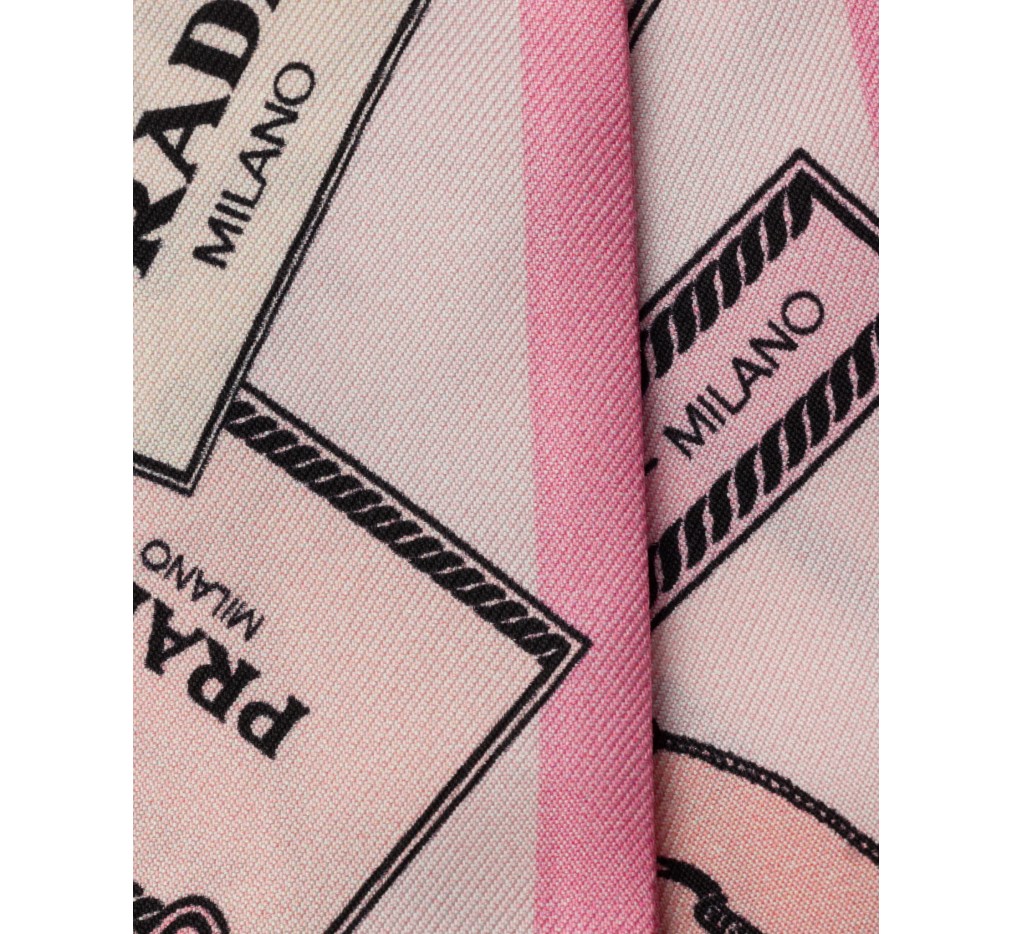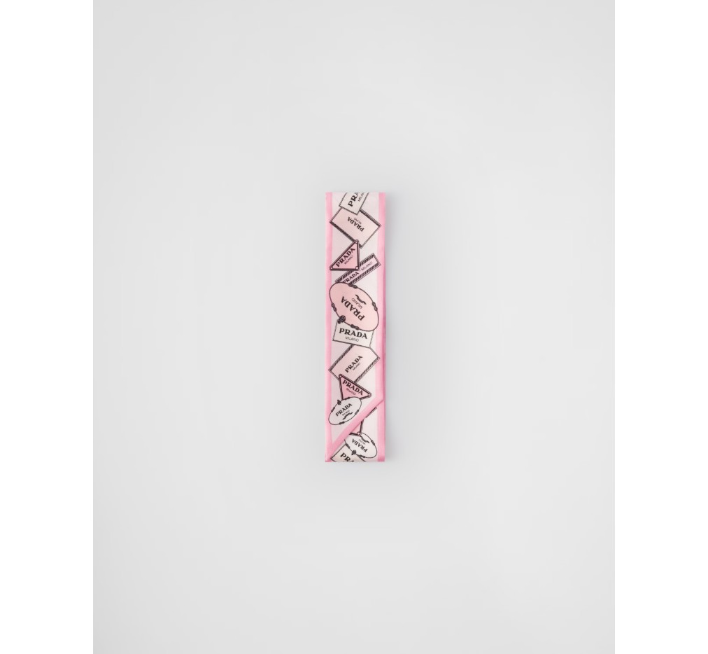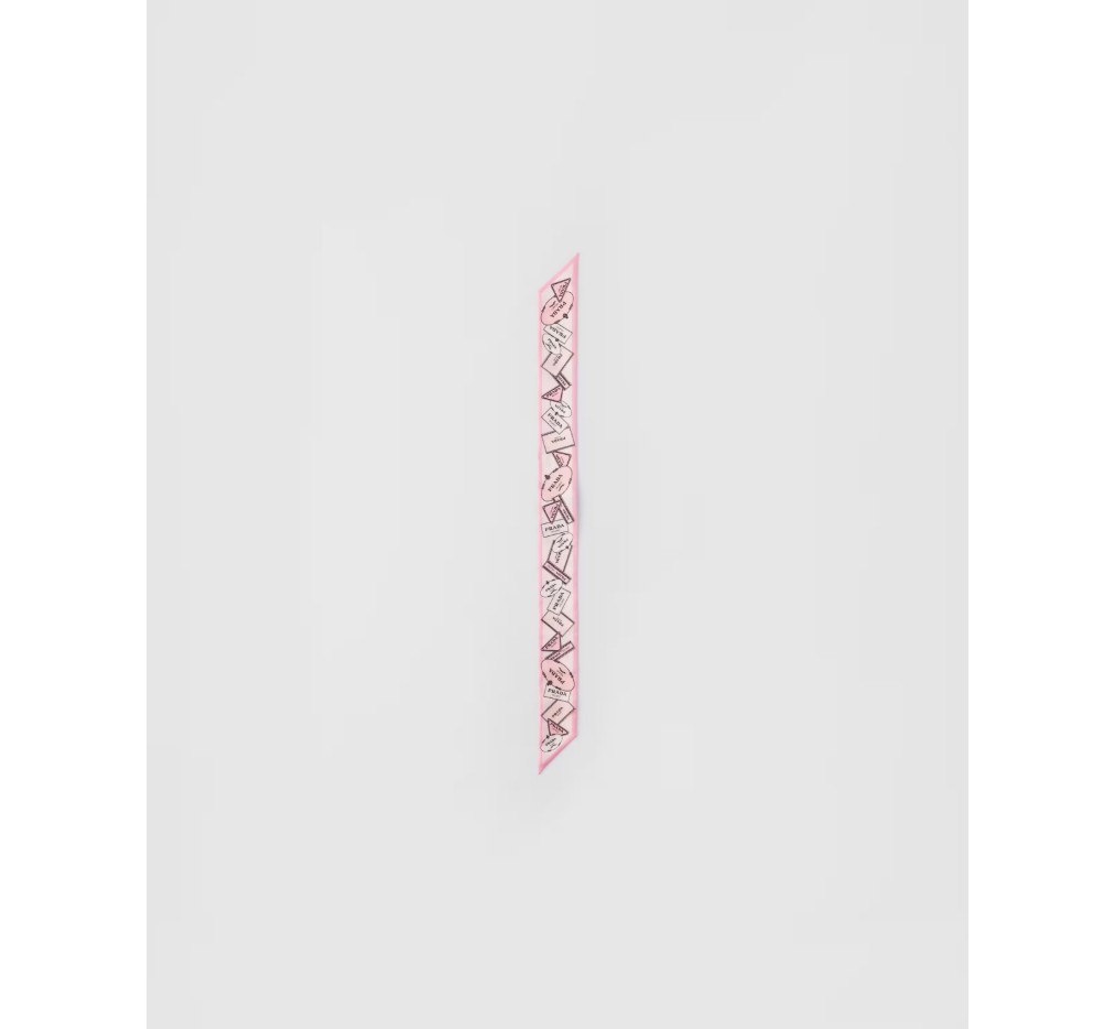 이 실크 트윌 스키니 스카프는 세련되고 모던한 프린트로 장식되어 있으며, 다양한 버전의 프라다 로고가 특징입니다.