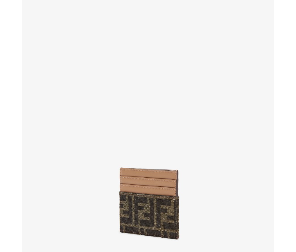 Card case with central compartment and six card slots. Made of jacquard fabric with the iconic FF motif in brown, and beige calfskin. Gold-finish metalware.