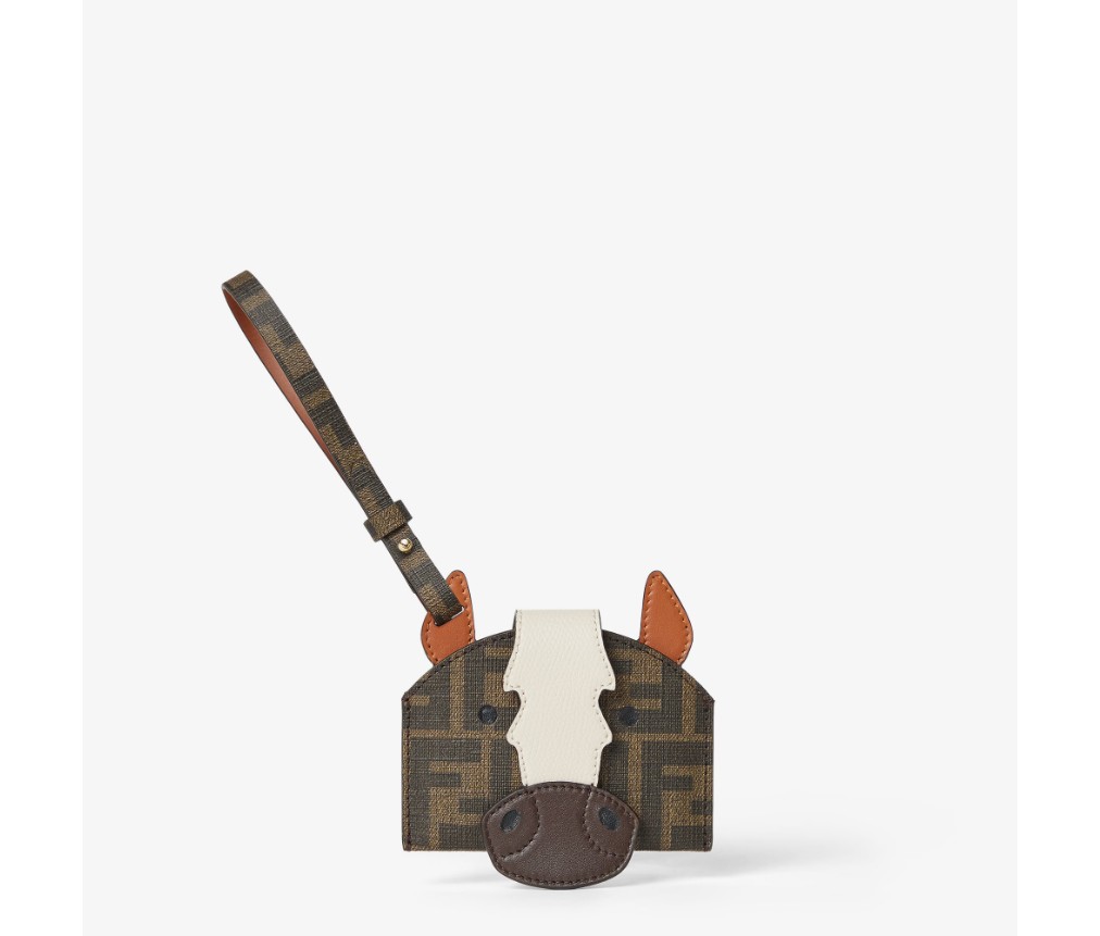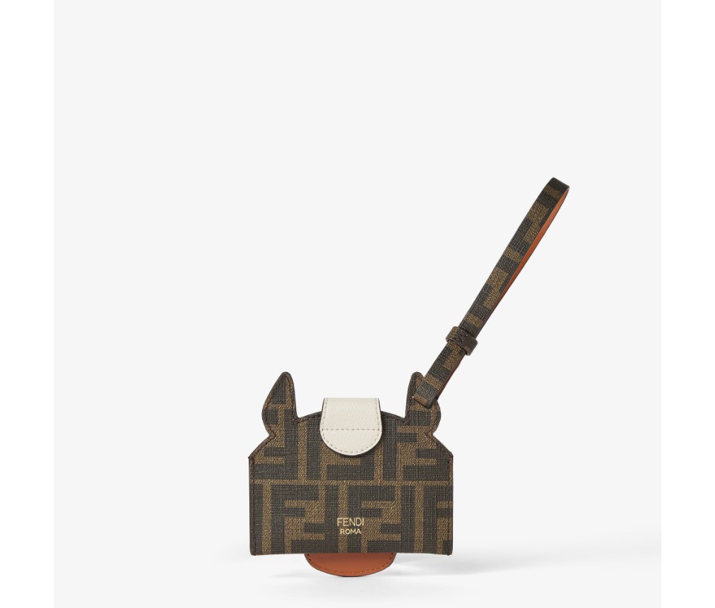 Fendi Best Friends Forever card holder with horse-head design. Features an internal compartment and clasp with bridge and hidden press stud. Leather strap to attach it to bags and belts. Made of fabric with iconic FF motif and white and brown details. Gold-finish metalware.