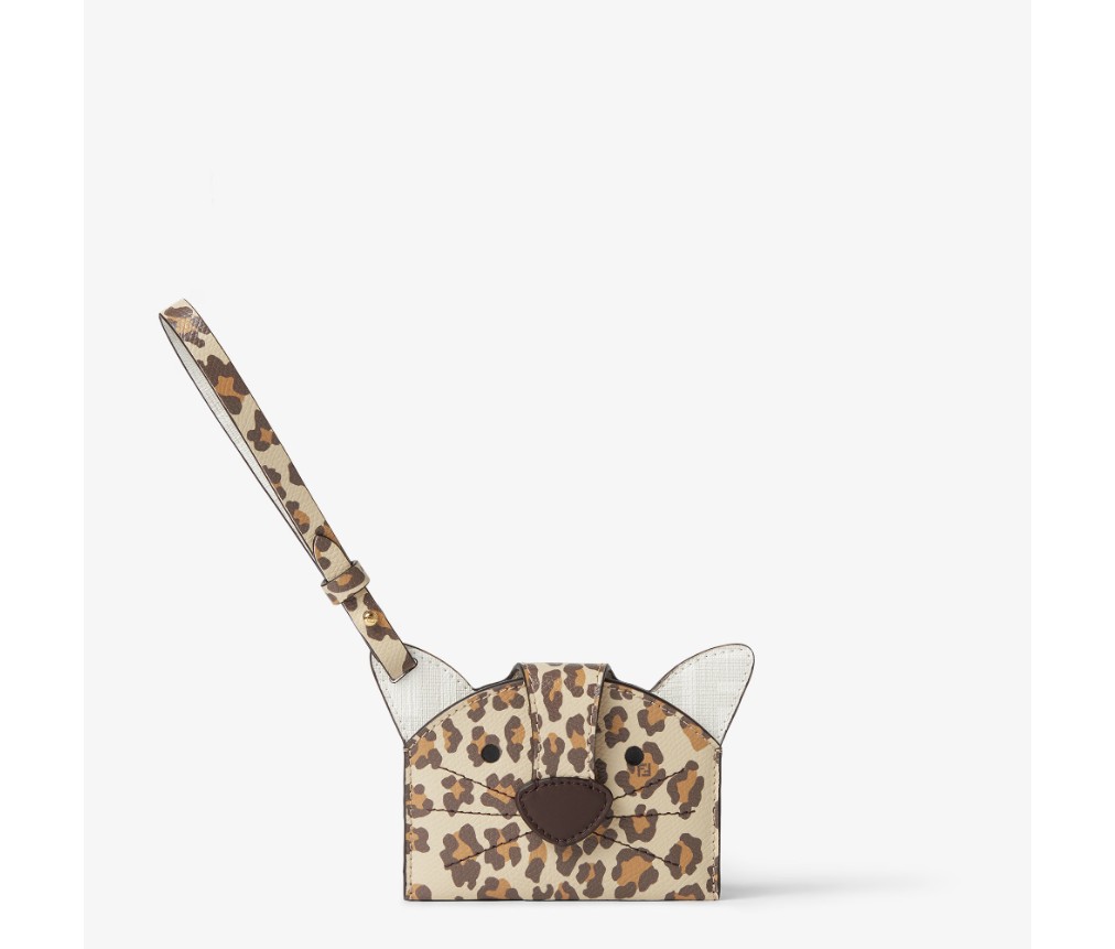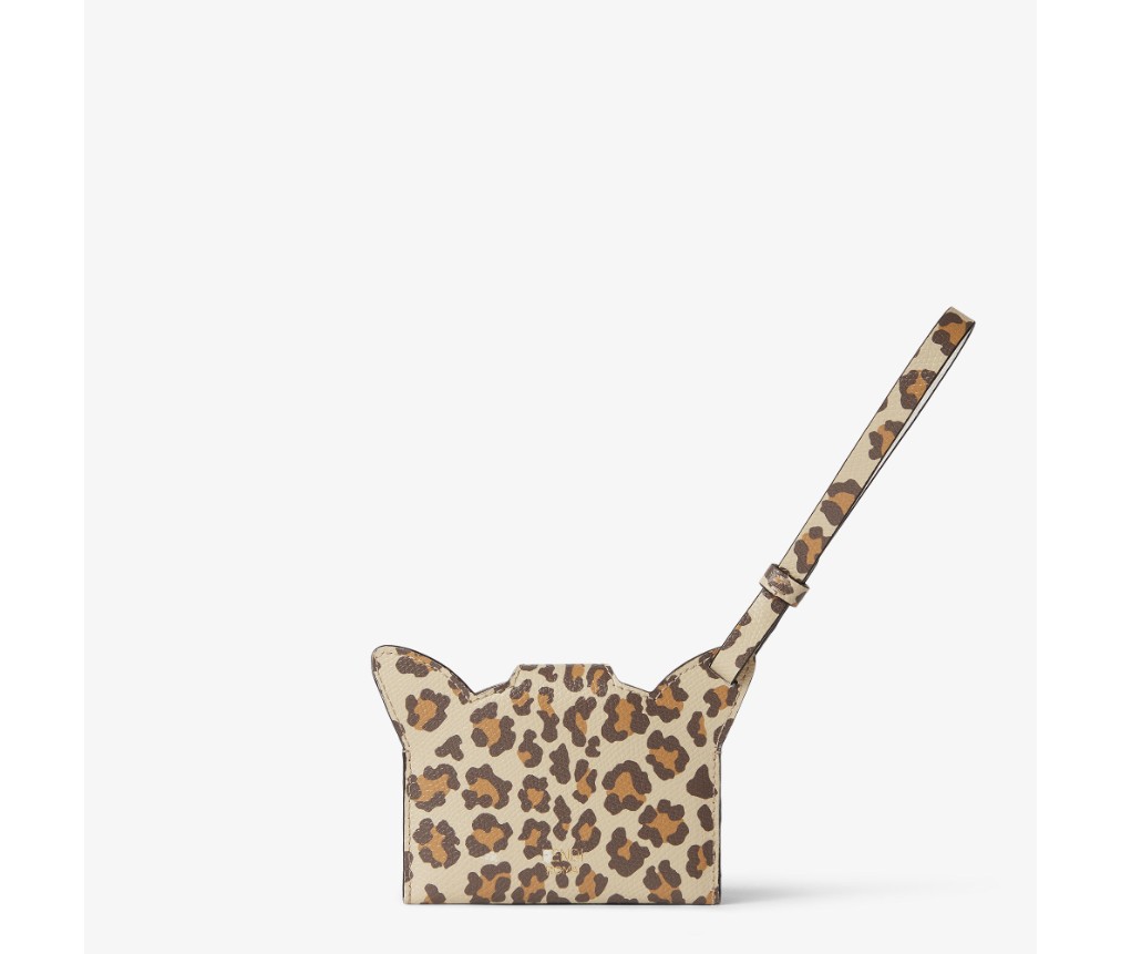 Fendi Best Friends Forever card holder with jaguar-head design. Features an internal compartment and clasp with bridge and hidden press stud. Leather strap to attach it to bags and belts. Made of calfskin with Fendi Leo multicolour animalier print and white details. Gold-finish metalware.