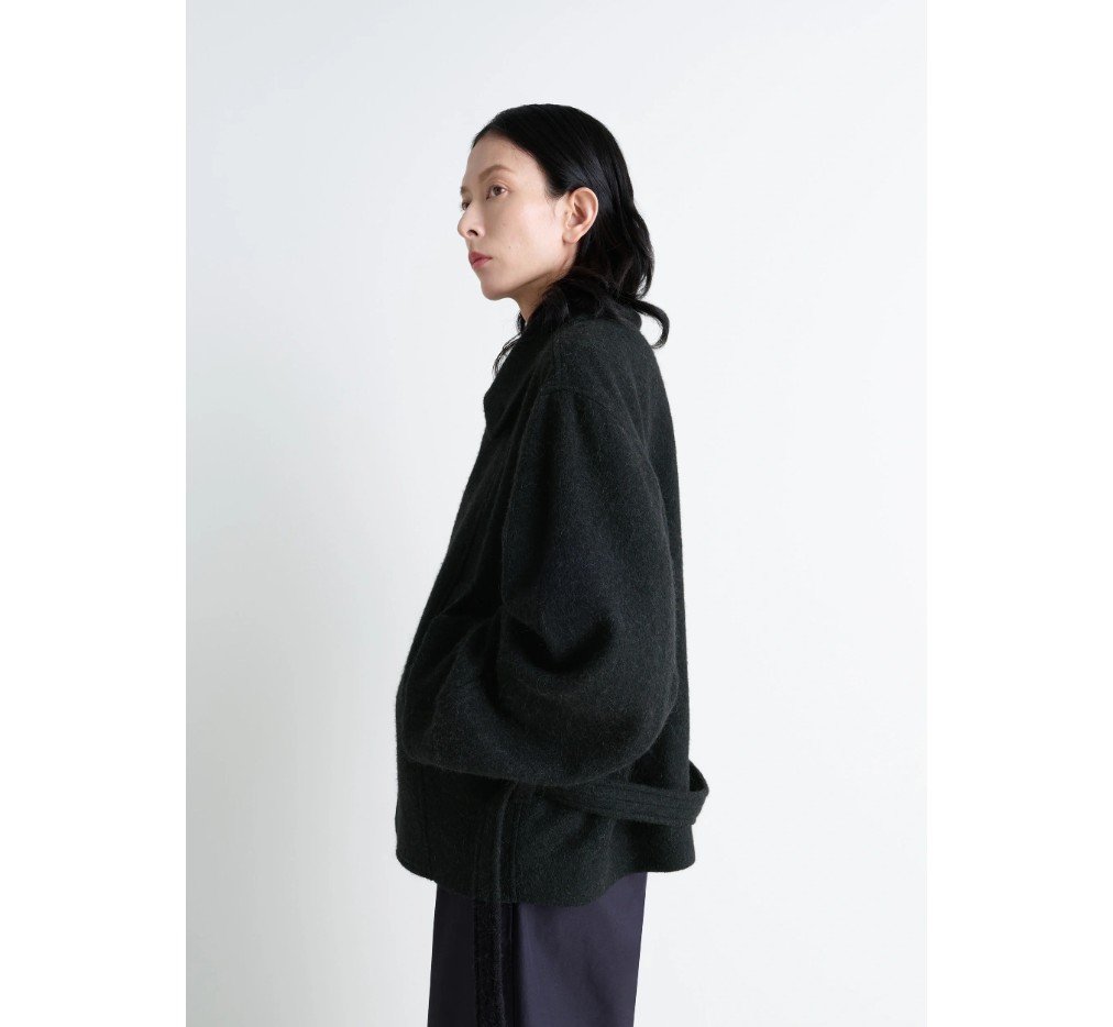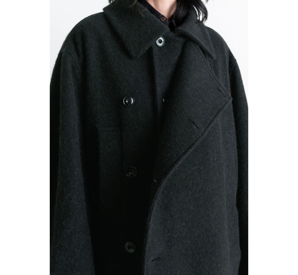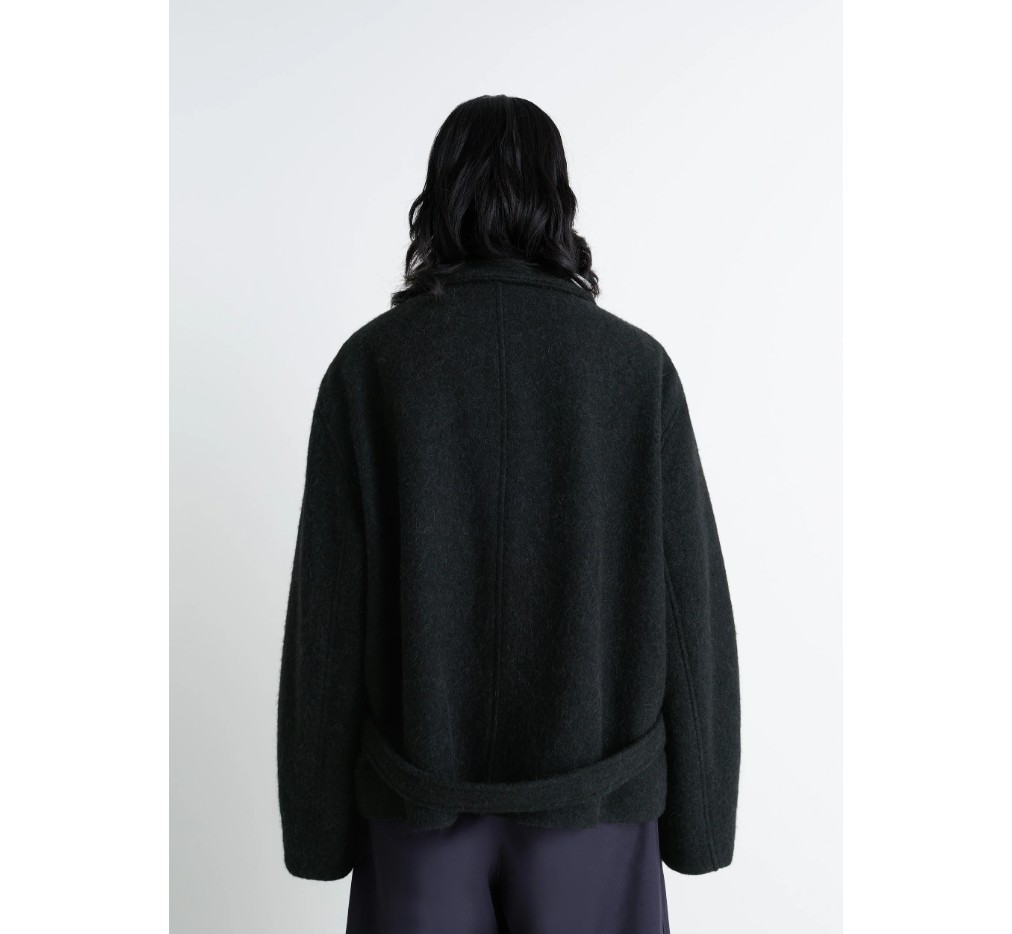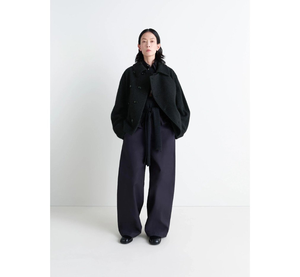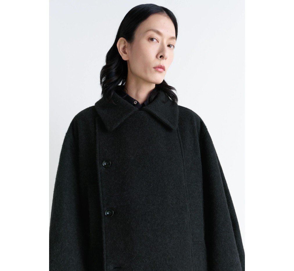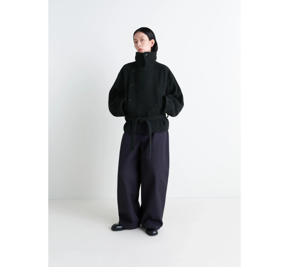 This short, asymmetrical coat features a button-down or loose panel, inspired by Lemaires love of movement. This piece is crafted in a rich, warm fabric. The wool-alpaca blend gives it texture and relief, as well as lightness.