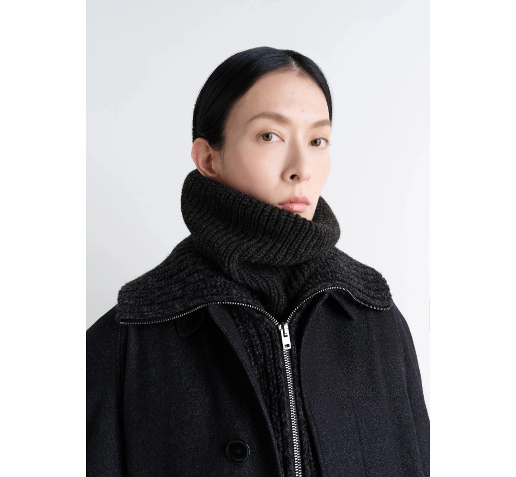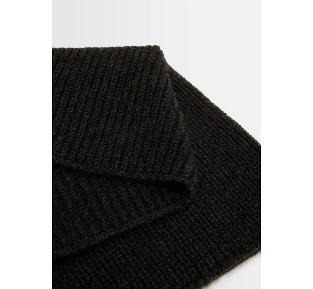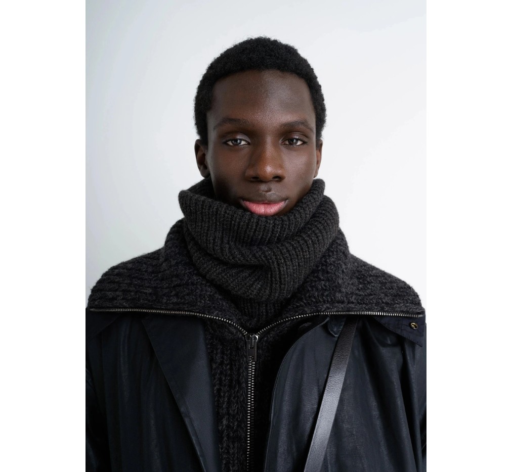 This snood is made from a ribbed wool and alpaca blend, a knit that is soft and warm to the touch.